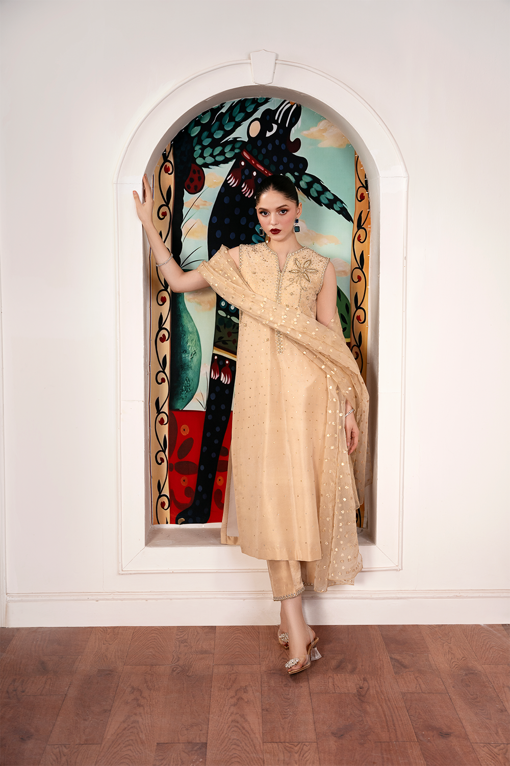 - Sleeve Less Shirt, Trouser & Dupatta.
