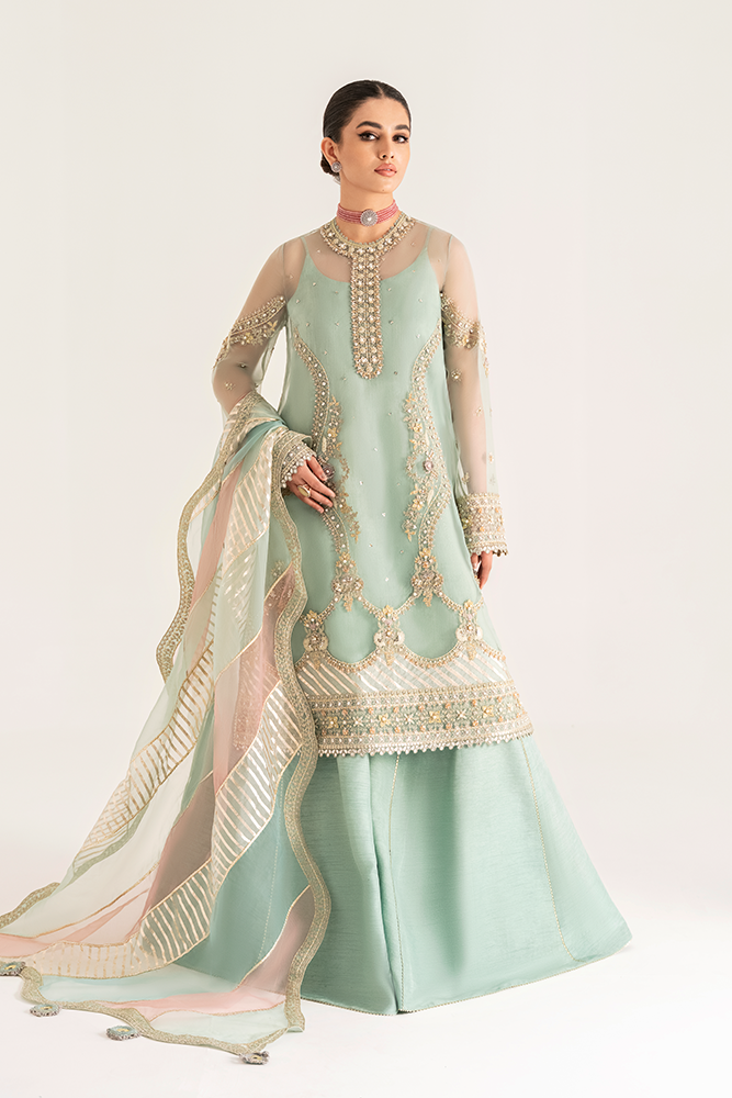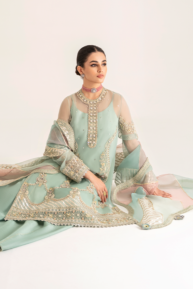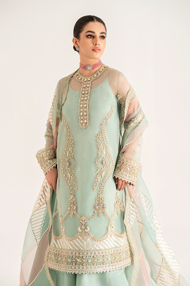 Embrace the enchanting beauty of Elaheh, a dress that embodies the whimsical and magical spirit. The intricate organza shirt is adorned with beautiful pearl and stone work, while the sheer organza dupatta boasts stunning Tilla and sequin embroidery. The raw silk trouser offers a luxurious and comfortable fit, making this ensemble perfect for a night of celebration and joy.
