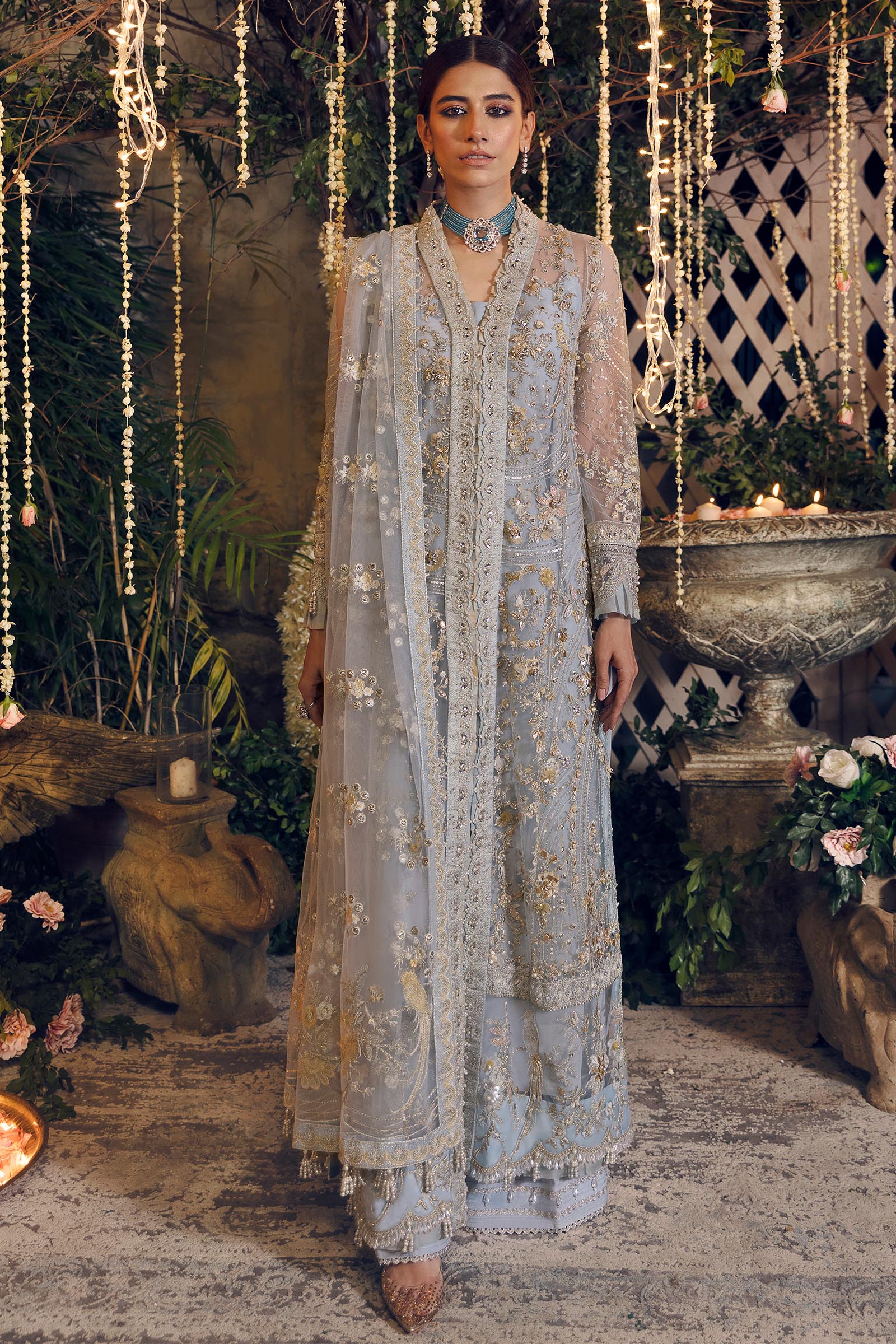 The luxuriously frosted tulle in 'Forouzan', envelops the body in enthralling delicacy. 3D florals, metallic threads and iridescent motifs make for an enchanting display of grandeur. The Center slit shirt silhouette is worn over flared trousers embellished at the cuffs and is paired with a diaphanous dupatta showered with detailed motifs and borders to make for an effortlessly elegant formal look.