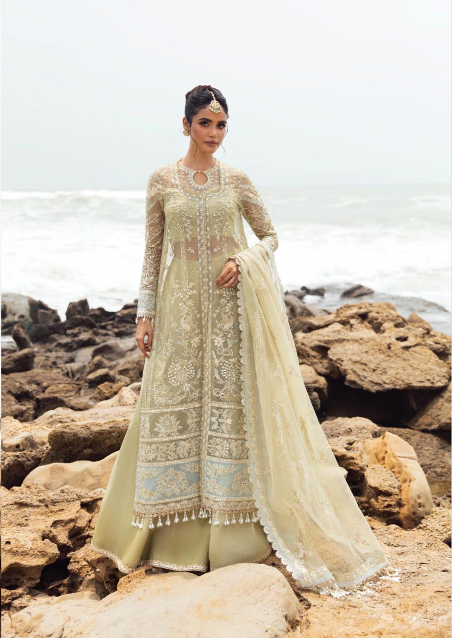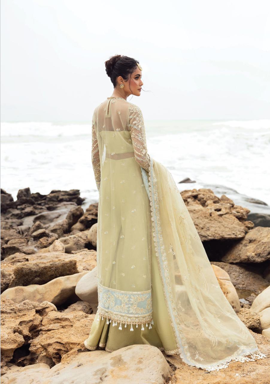 EMBRACE ELEGANCE WITH "LEELA" - A LONG FRONT-OPEN SHIRT CRAFTED FROM LUXE ORGANZA AND ADORNED WITH EXQUISITE, SOFT-COLOURED EMBROIDERY. THE UNIQUE EMBROIDERED NECKLINE, INSPIRED BY FLORAL MOTIFS, IS EMBELLISHED WITH PANNI, SEQUINS, AND TILLA, WHILE THE AQUA SLEEVES AND DAMAN BORDERS ENHANCE ITS CHARM. PAIRED WITH RICH RAW SILK PANTS, THIS ENSEMBLE CELEBRATES LUXURIOUS CRAFTSMANSHIP. THE ACCOMPANYING DUPATTA, ADORNED WITH SUMPTUOUS EMBROIDERY ADDS THE PERFECT FINISHING TOUCH.