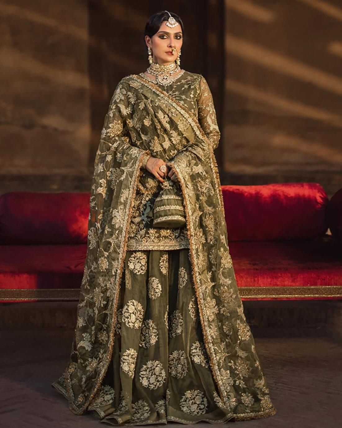 An enchanting ensemble that captures the sophistication of premium vintage fashion. The centerpiece is a mehndi green organza short shirt, adorned with intricate jali embroidery patterns and delicate gota hand embellishments. Paired seamlessly with a matching mehndi green organza sharara, embellished with exquisite boti work, this ensemble radiates graceful charm and vintage allure. Completing the look is a mehndi green organza dupatta, featuring beautifully embroidered jali patterns inspired by royal vintage aesthetics, and accentuated with a four-sided kiran border. This touch of regal opulence infuses the ensemble with understated grandeur, making it a perfect blend of historical elegance and modern sophistication.