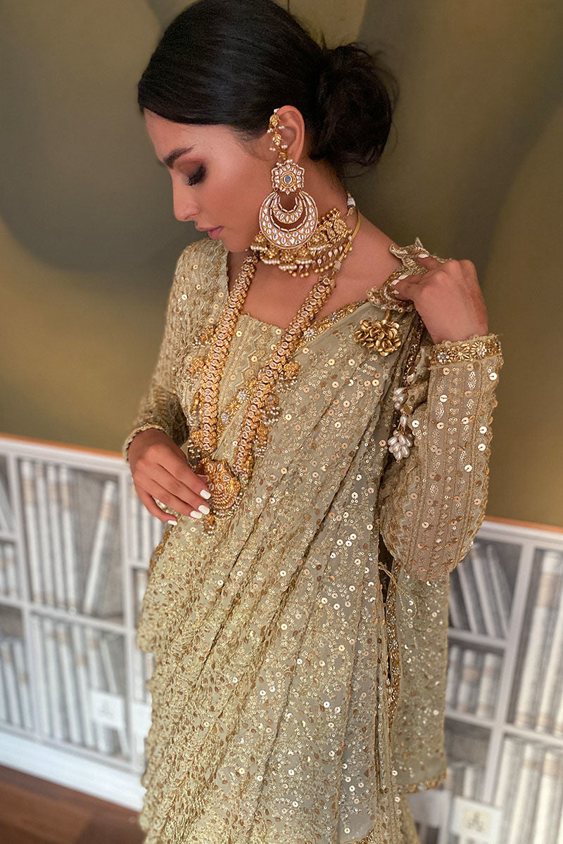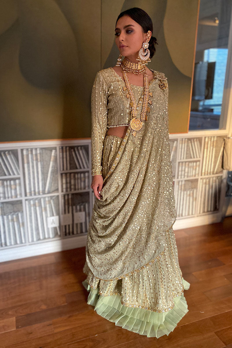 A regal mint green worked lengha choli with handworked zardozi brooches, tassels and pleats detailing. Paired with a matching stitched pre-drapped dupatta (not attached to the choli). A separate dupatta to be worn on the head can be ordered as well.