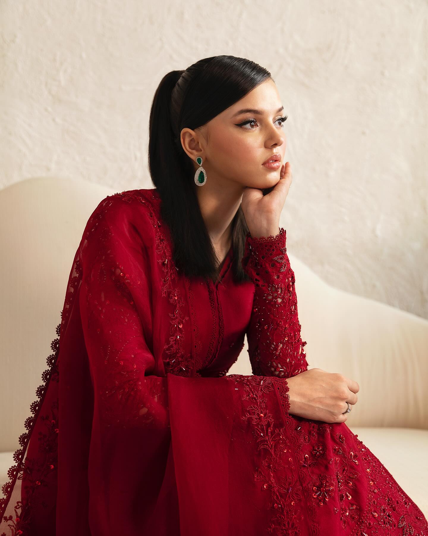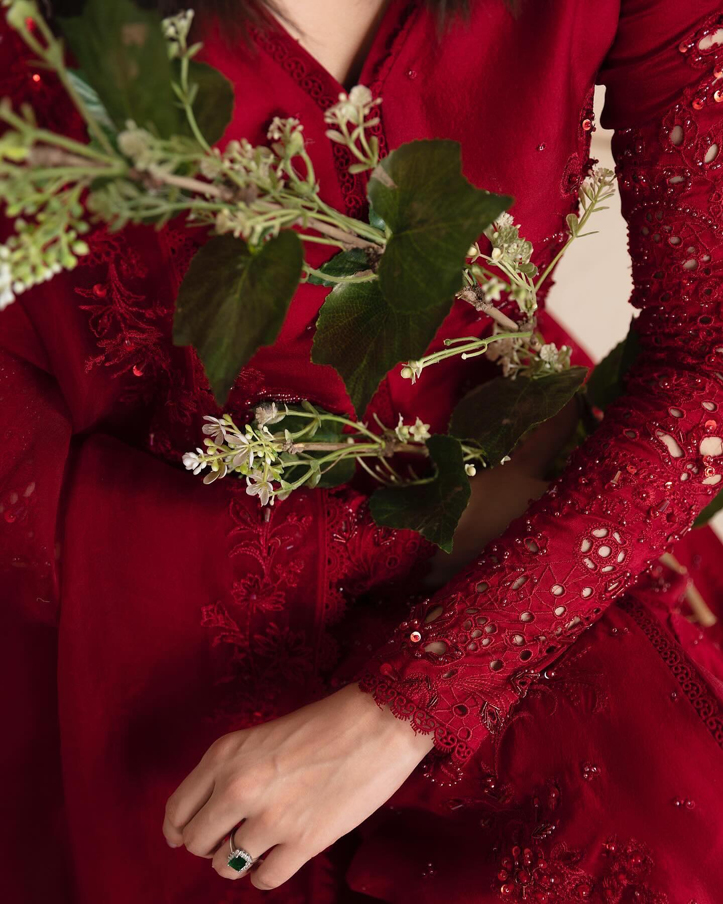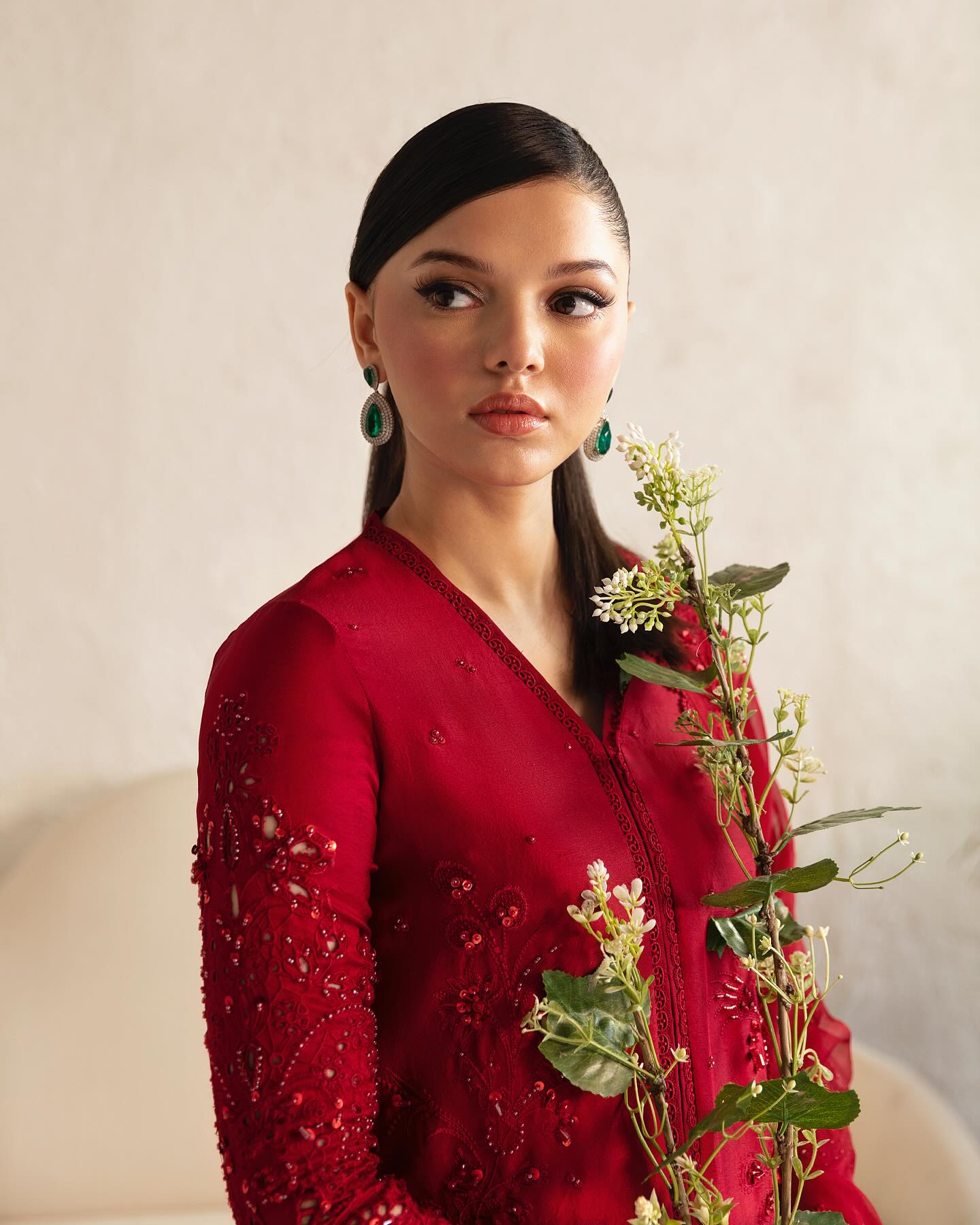 “Aleysa” epitomizes timeless elegance in a shade of ravishing red. Crafted from pure raw silk and adorned with intricate hand embroidery, this ensemble exudes sophistication and luxury, making every moment unforgettable.