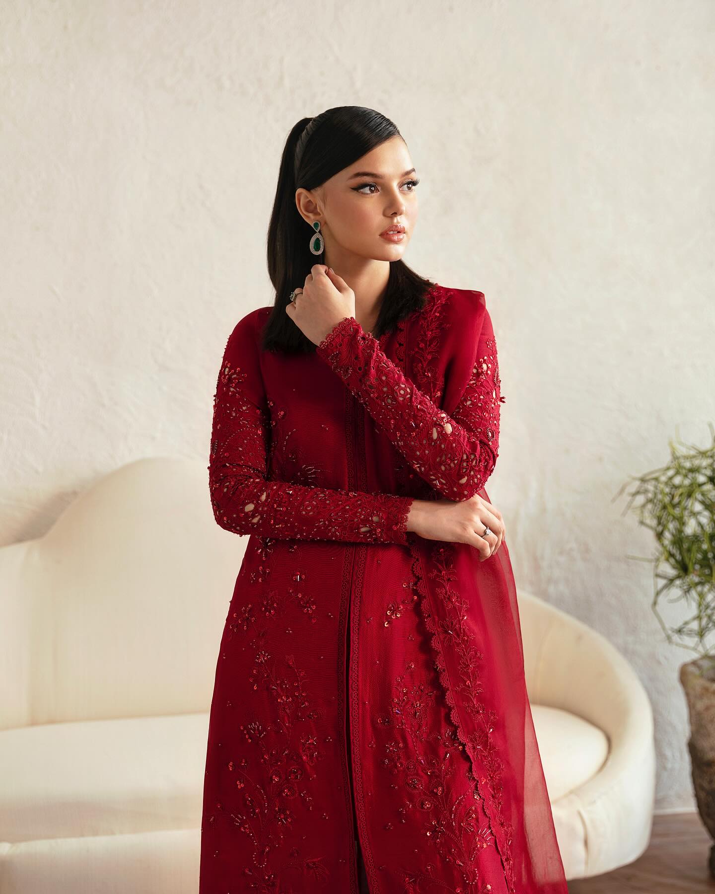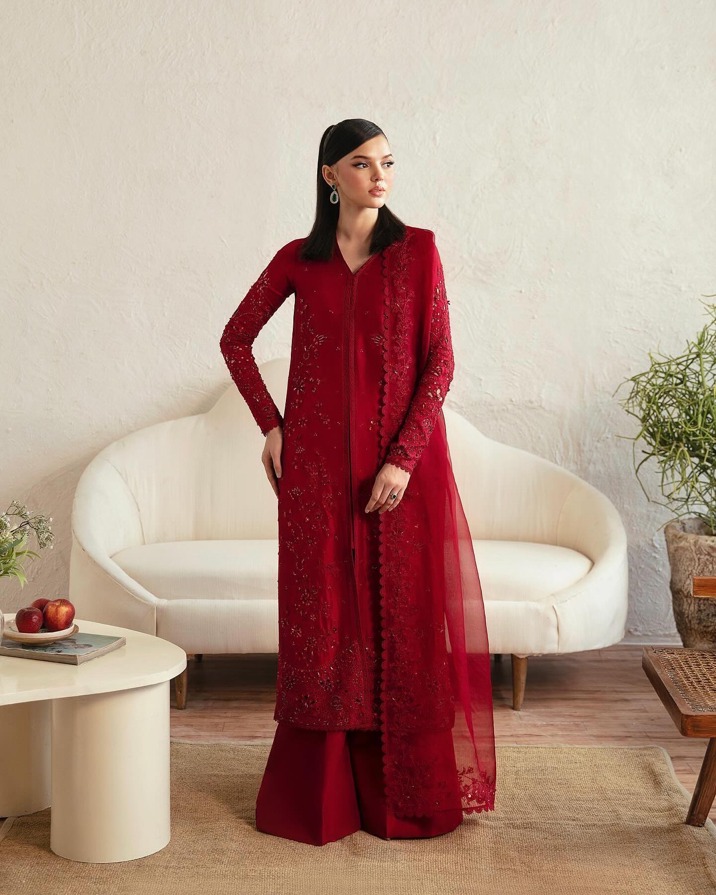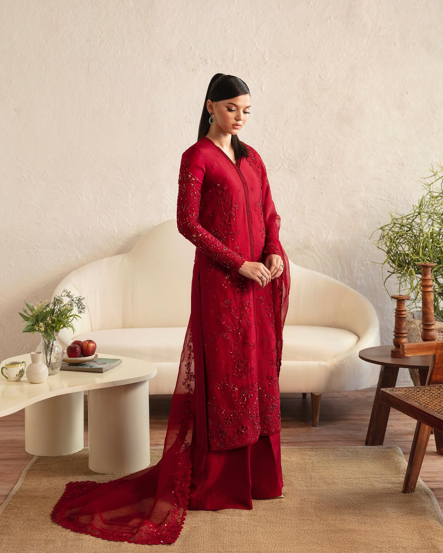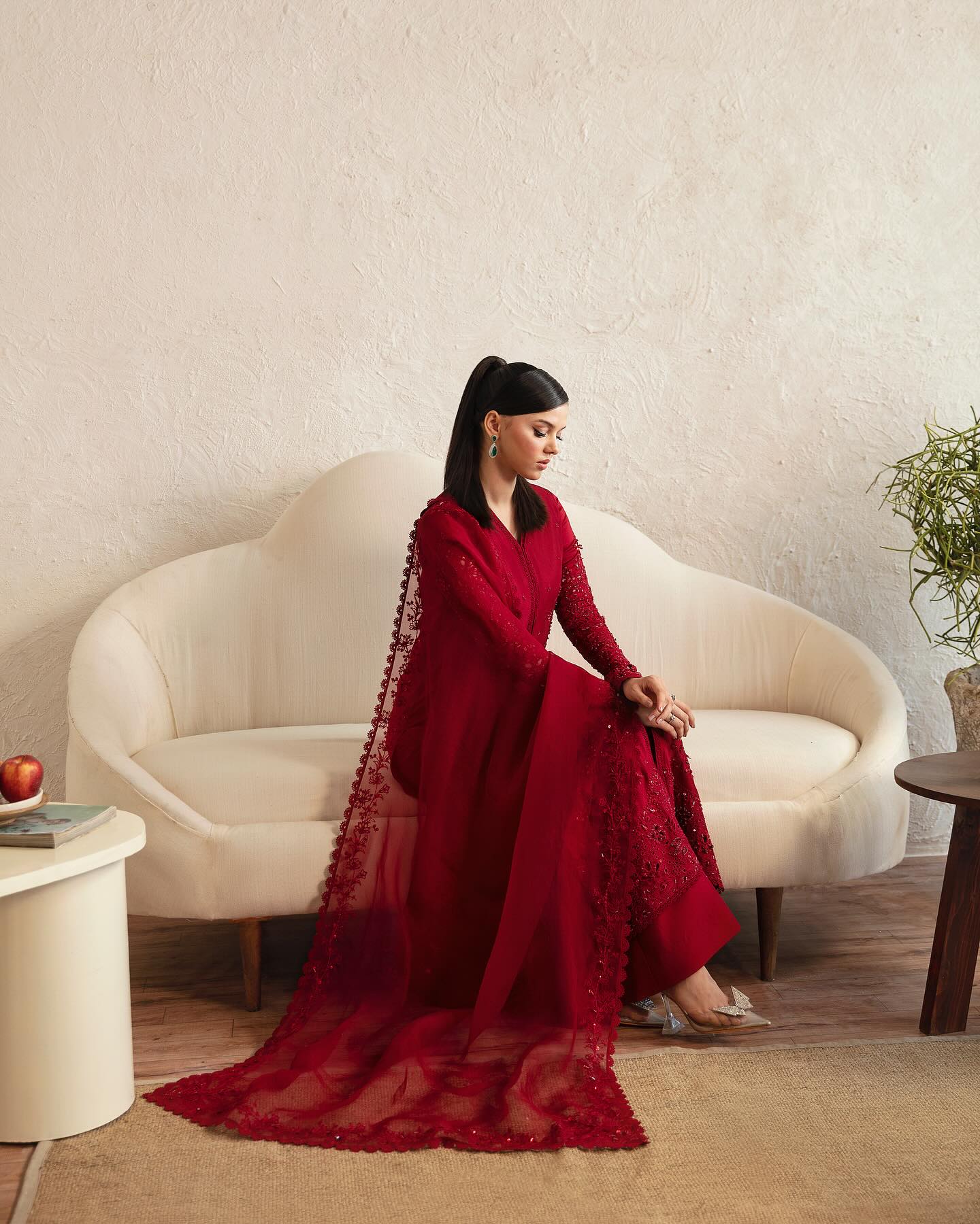 “Aleysa” epitomizes timeless elegance in a shade of ravishing red. Crafted from pure raw silk and adorned with intricate hand embroidery, this ensemble exudes sophistication and luxury, making every moment unforgettable.