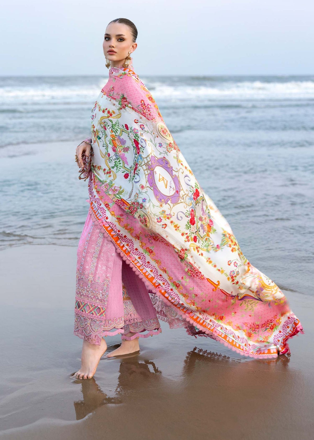 Aariana captures the essence of grace, where delicate craftsmanship meets refined luxury. The soft pink Schiffli fabric creates a beautiful textured canvas, accentuated by intricately embroidered borders along the front panels and patti, offering a sophisticated and ornate touch to the ensemble. The gentle pink hue evokes warmth, making this dress perfect for both daytime charm and evening allure. Paired with sleek dobby trousers, it strikes the perfect balance between contemporary comfort and classic elegance. The silk digital printed dupatta brings a vibrant contrast, infused with modern prints that elevate the overall design.