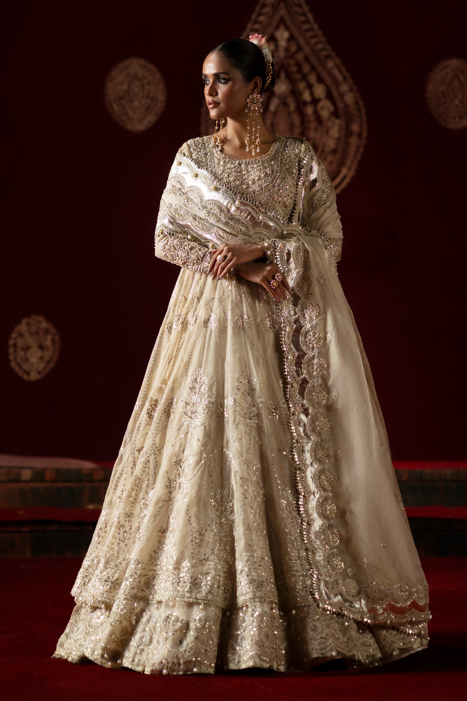 An opulent gold chanderi net tissue double-layered pishwas, adorned with intricate embroidery and delicate handwork details that exude timeless elegance. Paired with a regal jamawar lehnga and a graceful chanderi net dupatta, this ensemble is a perfect blend of tradition and luxury.