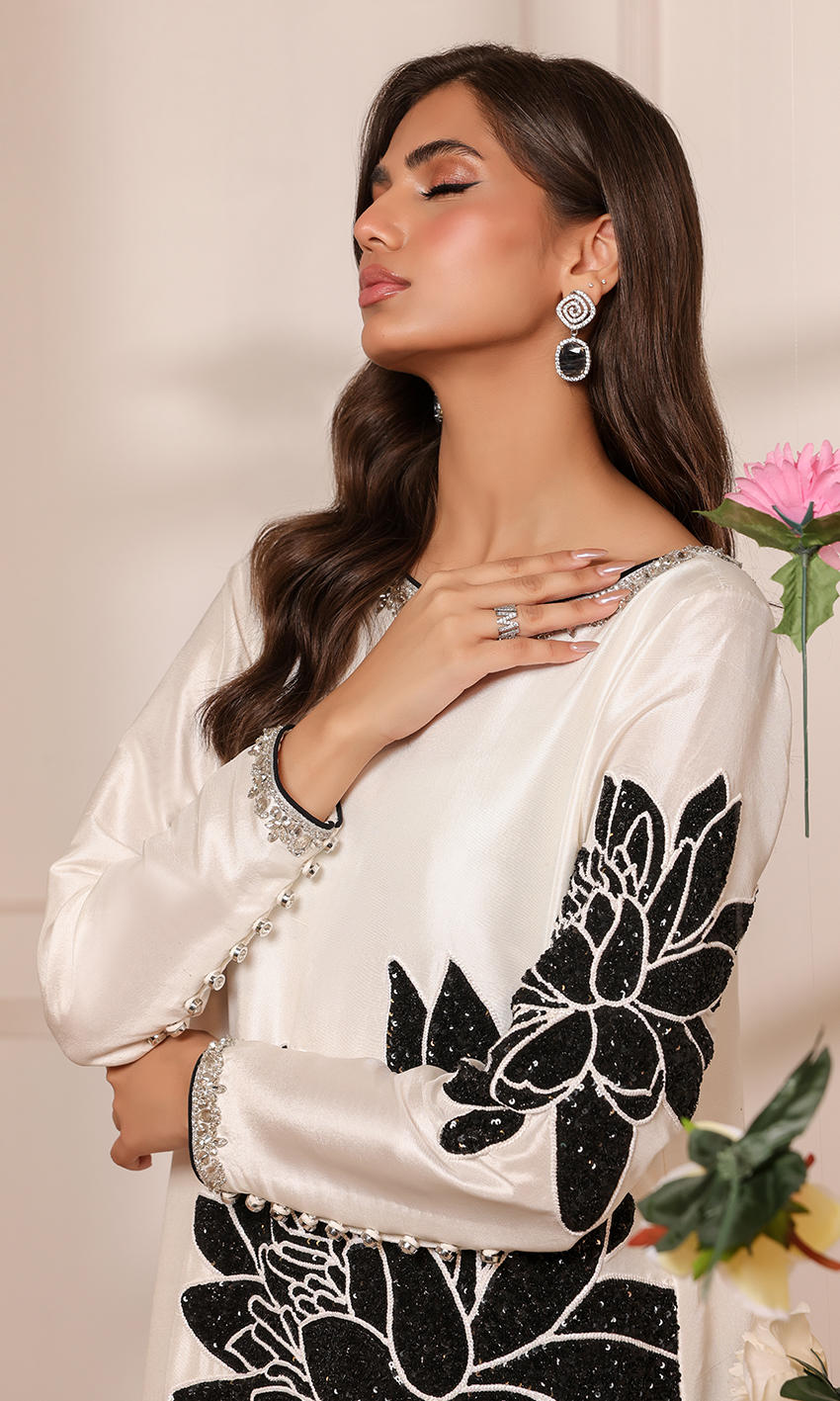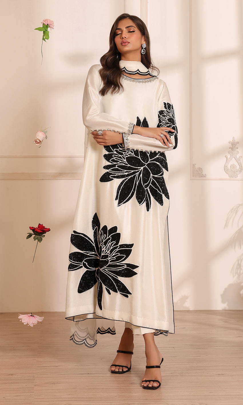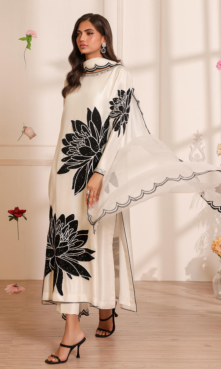 This exquisite white ensemble features a raw silk shirt adorned with an embellished neckline and intricate floral handwork. Paired with raw silk pants with button detailing and a chiffon dupatta featuring a scalloped border.