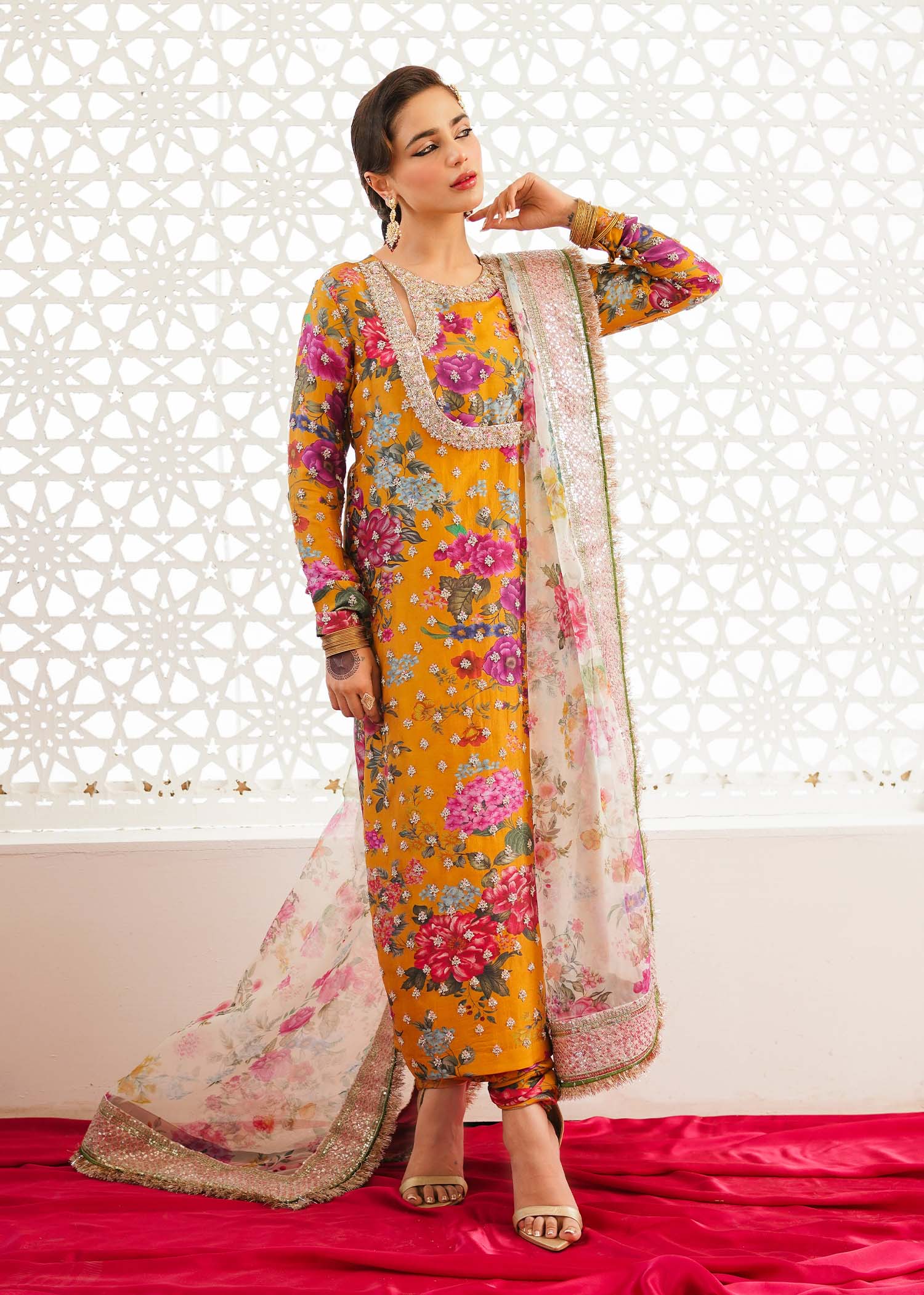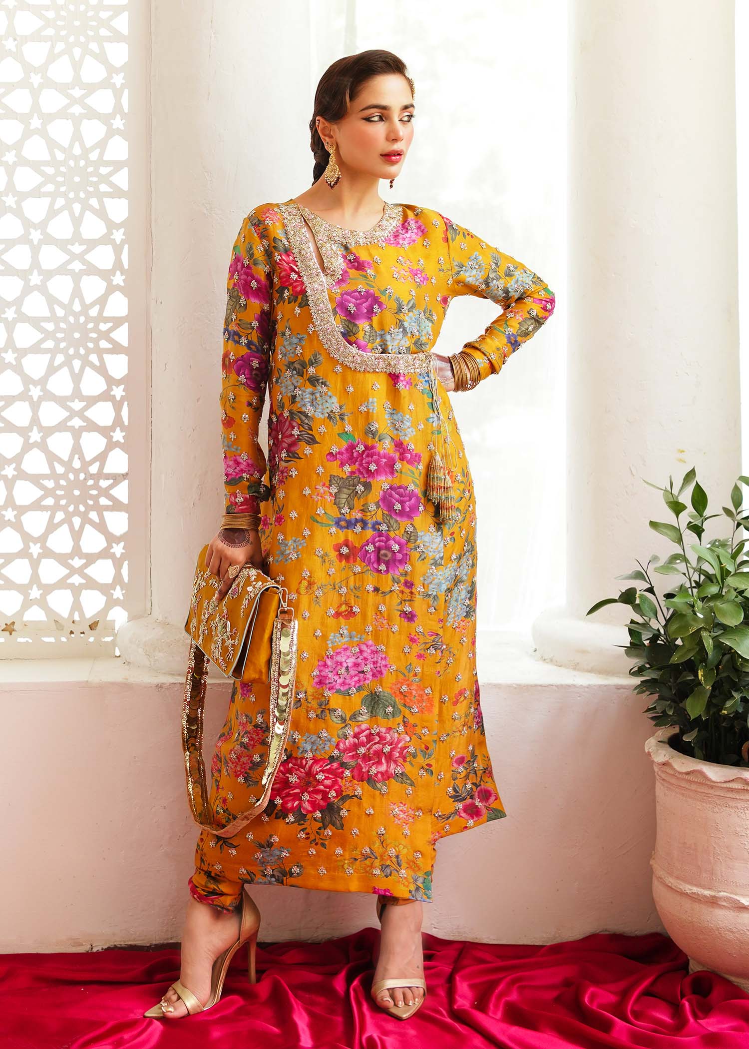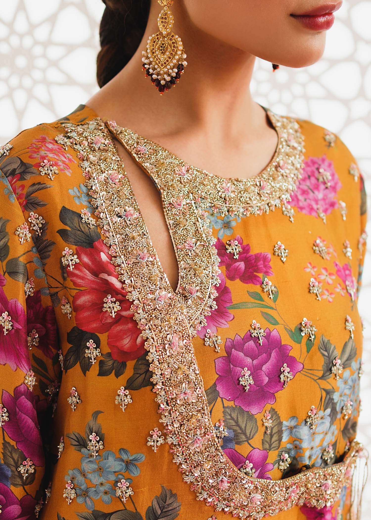 An alluring mustard raw silk printed shirt with intricate small bunches of buggle beads in pink and ice blue along with gold sequins spread all over shirt and sleeve beautifully. The Angrakha style neckline is adorned with intricate embellishment of Mukesh, dabka, naqshi and pink and ice blue buggle beads.