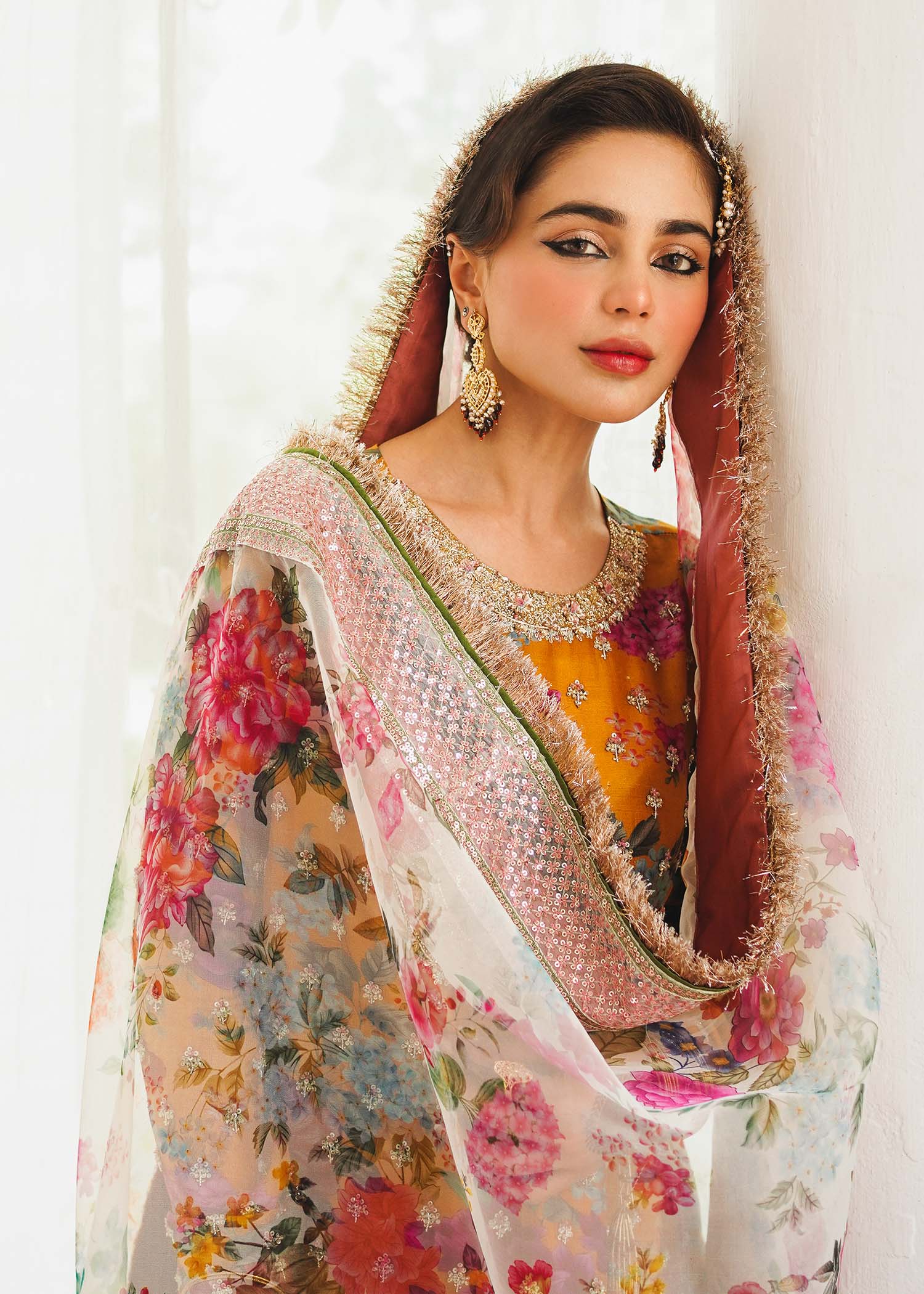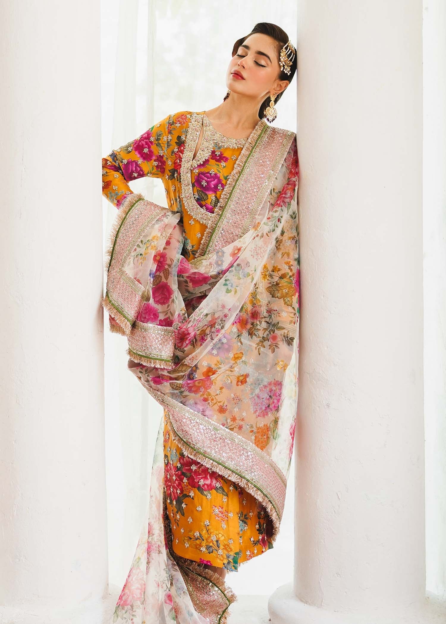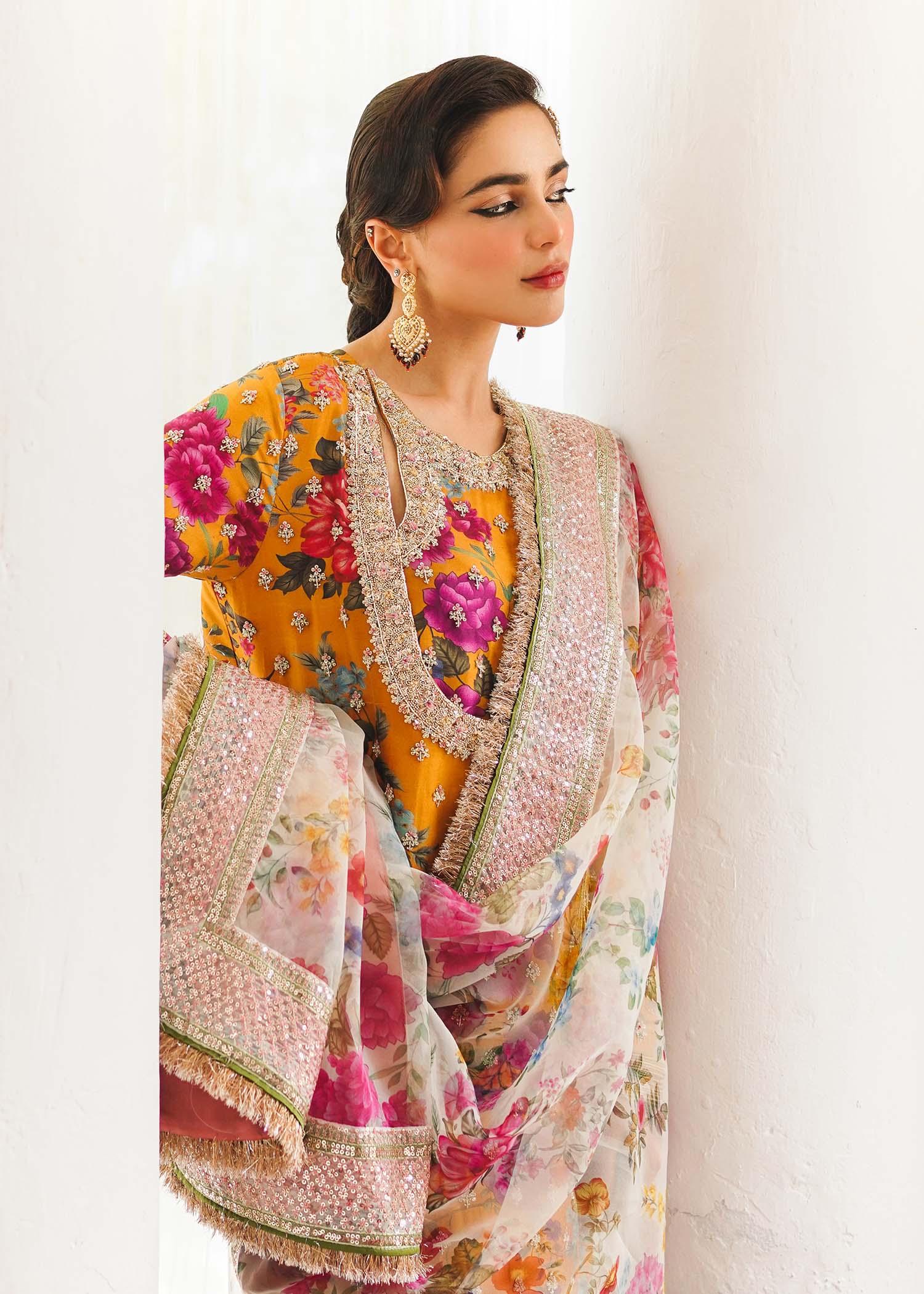 An alluring mustard raw silk printed shirt with intricate small bunches of buggle beads in pink and ice blue along with gold sequins spread all over shirt and sleeve beautifully. The Angrakha style neckline is adorned with intricate embellishment of Mukesh, dabka, naqshi and pink and ice blue buggle beads.