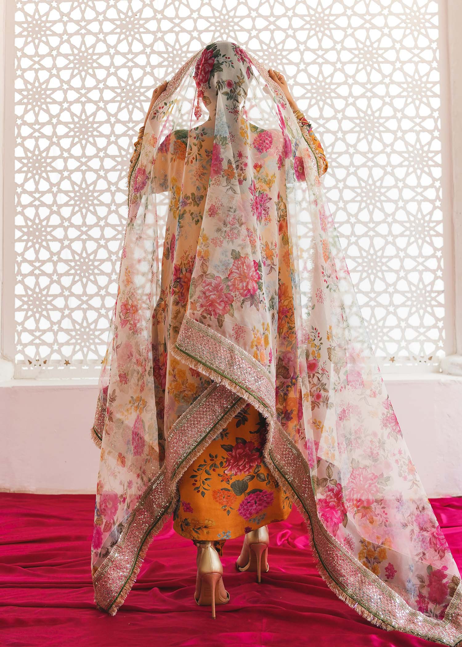It is paired with Raw silk printed chooridar and Ivory printed dupatta with four sided kiran which completes the look effortlessly.