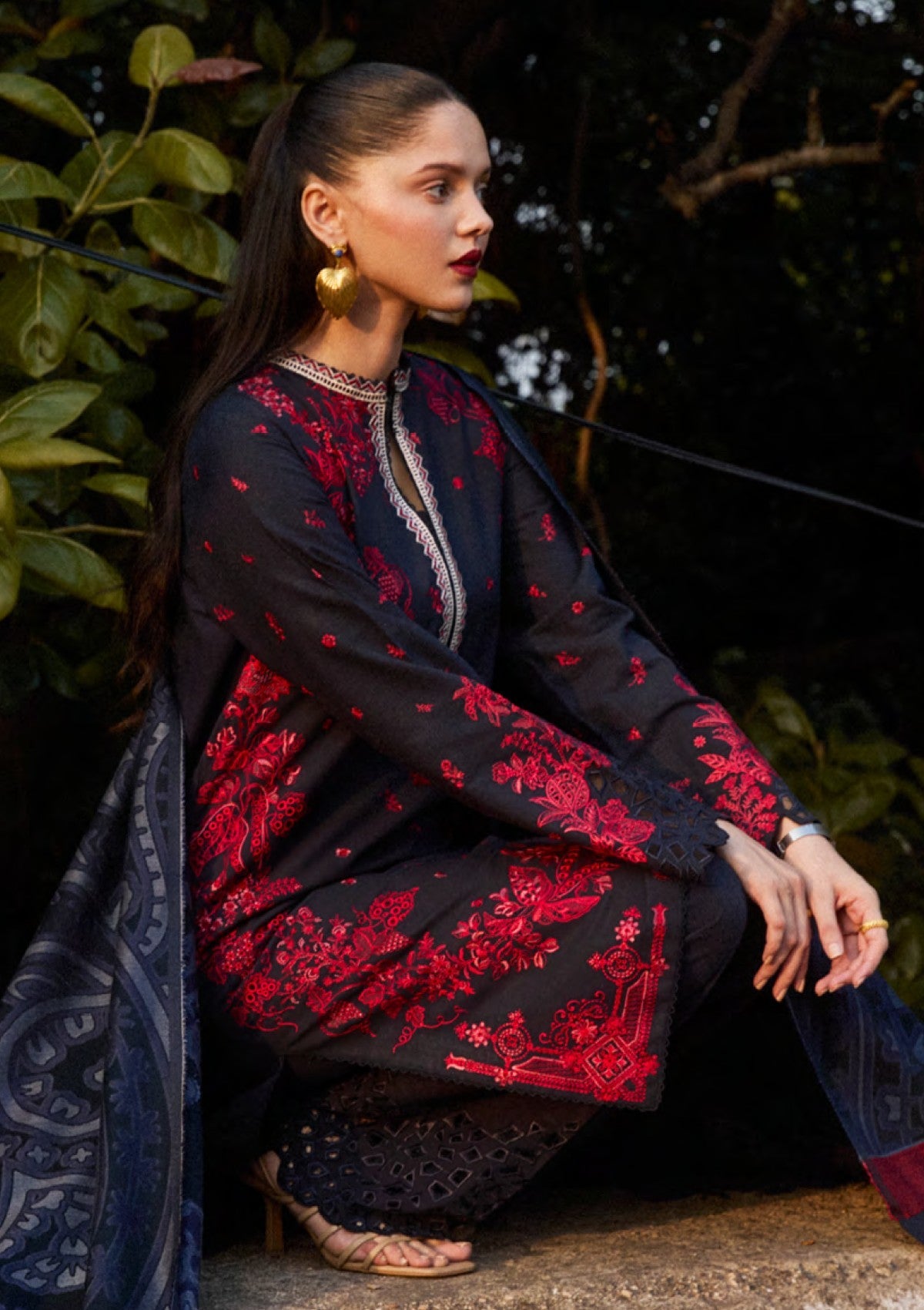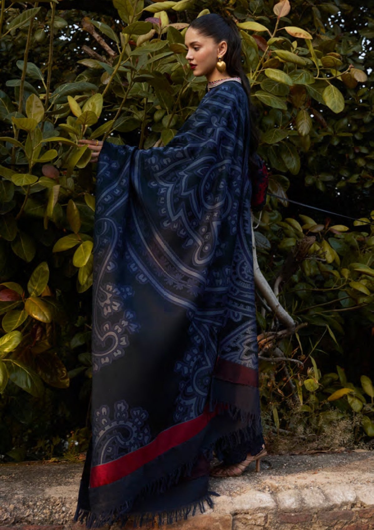 DARYA unveils a beautiful composition of floral embroidery in red on a deep blue khaddar surface, styled with a blue jacquard shawl, bringing about a seamless fusion of style and sophistication.