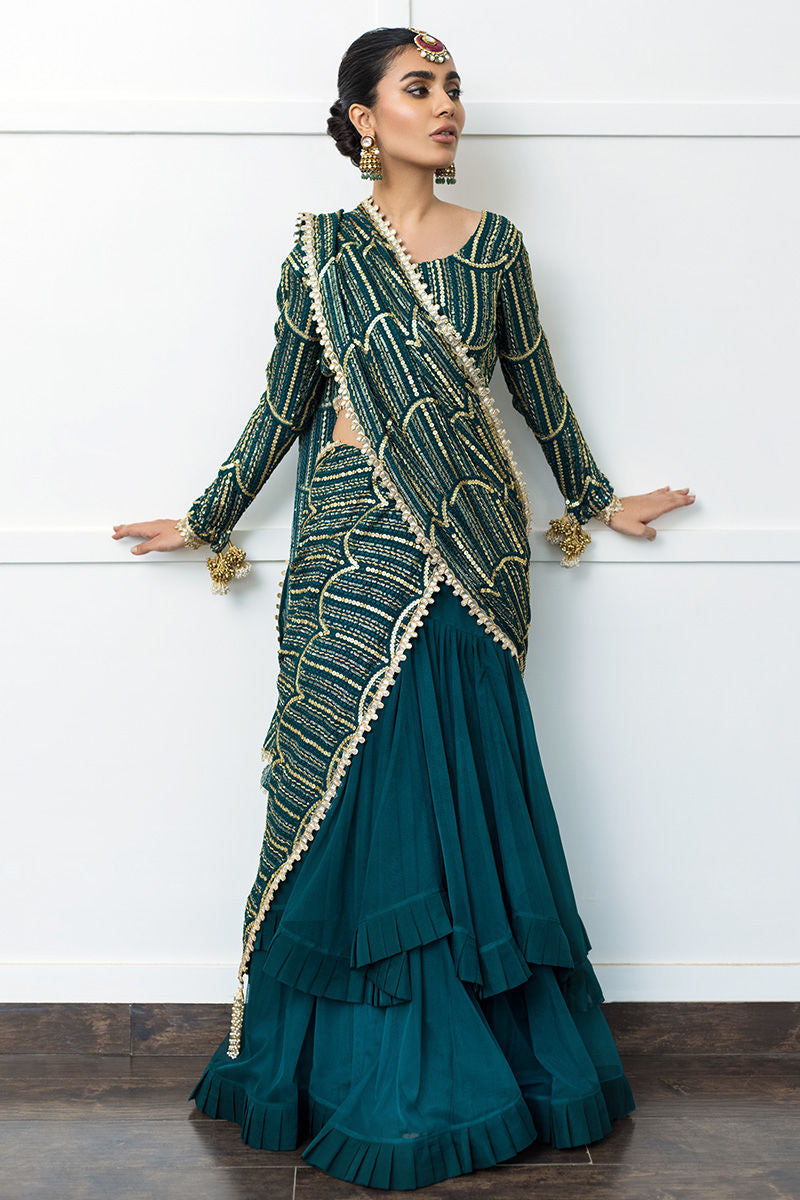 Statement net tiered lengha with pleats and pulled out thread detailing paired with a beautiful self embroidered and sequins worked choli with gold gota accents.The net lengha has cotton silk lining inside. Choli and dupatta with self embroidery and gold sequins work, with hand worked zardozi brooches at the back of the choli. The dupatta matches the choli and can be styled as shown in the picture, or any other way as well.