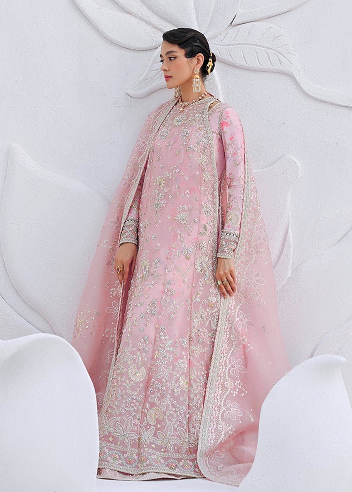 - Powder pink sleeveless halter-neck organza upper layer with heavy embroidery and embellishments, paired with printed, raw silk undershirt and fitted sleeves with handwork and lace details.