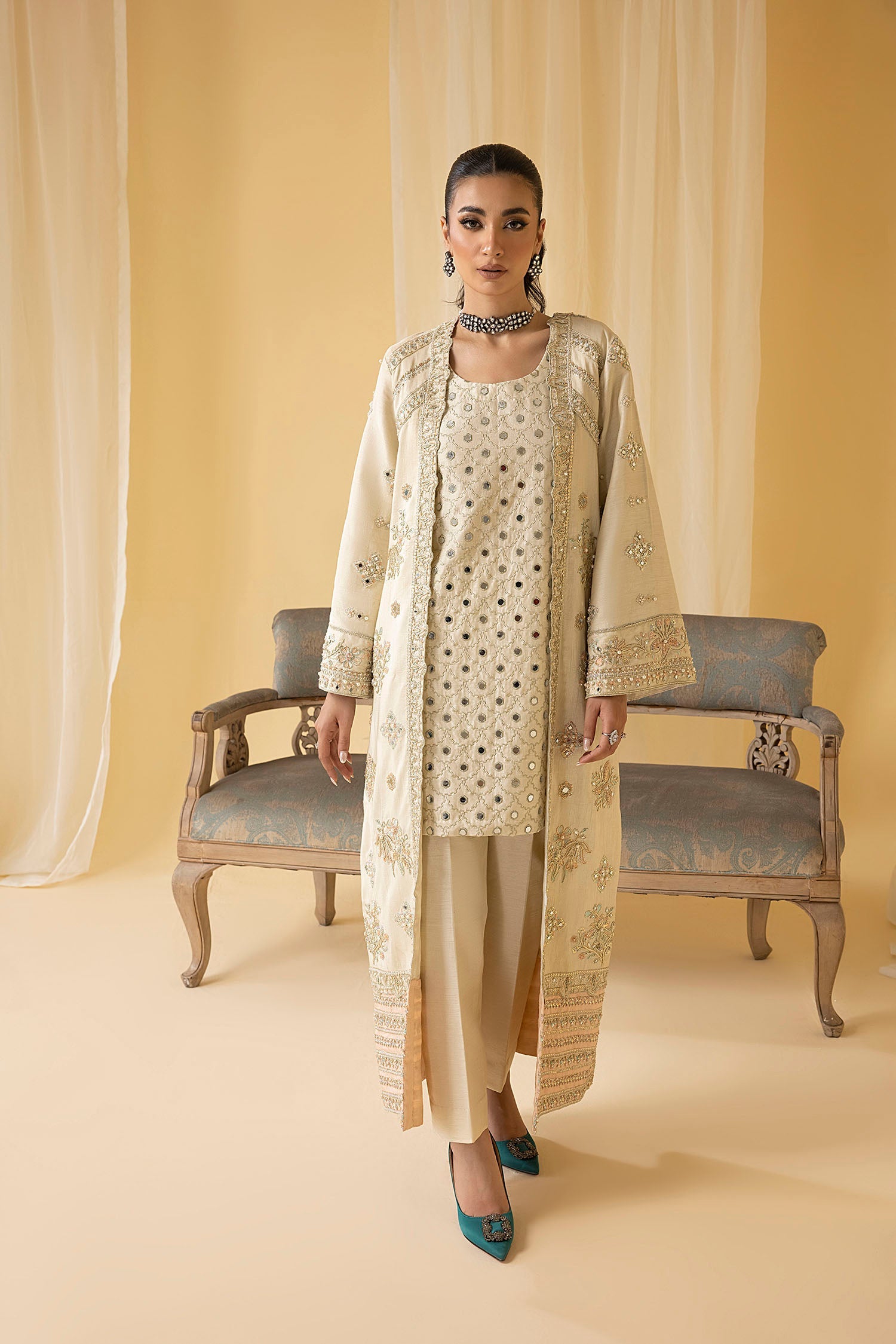 'Iris' re-envision glamour with this stunning outfit, featuring a beautifully crafted open jacket and a dazzling raw silk inner shirt beautifully embellished with mirror work. defining pure craftsmanship with naqshi, dabka and pearls hand embellishments, this statement outfit oozes elegance and sophistication. The solid trouser compliments the chic look and the gracefully draped dupatta with stunning mirror work adds sensuality, while the intricate hand work makes a bold statement for any festive occasion. Truly a masterpiece of design and craftsmanship!