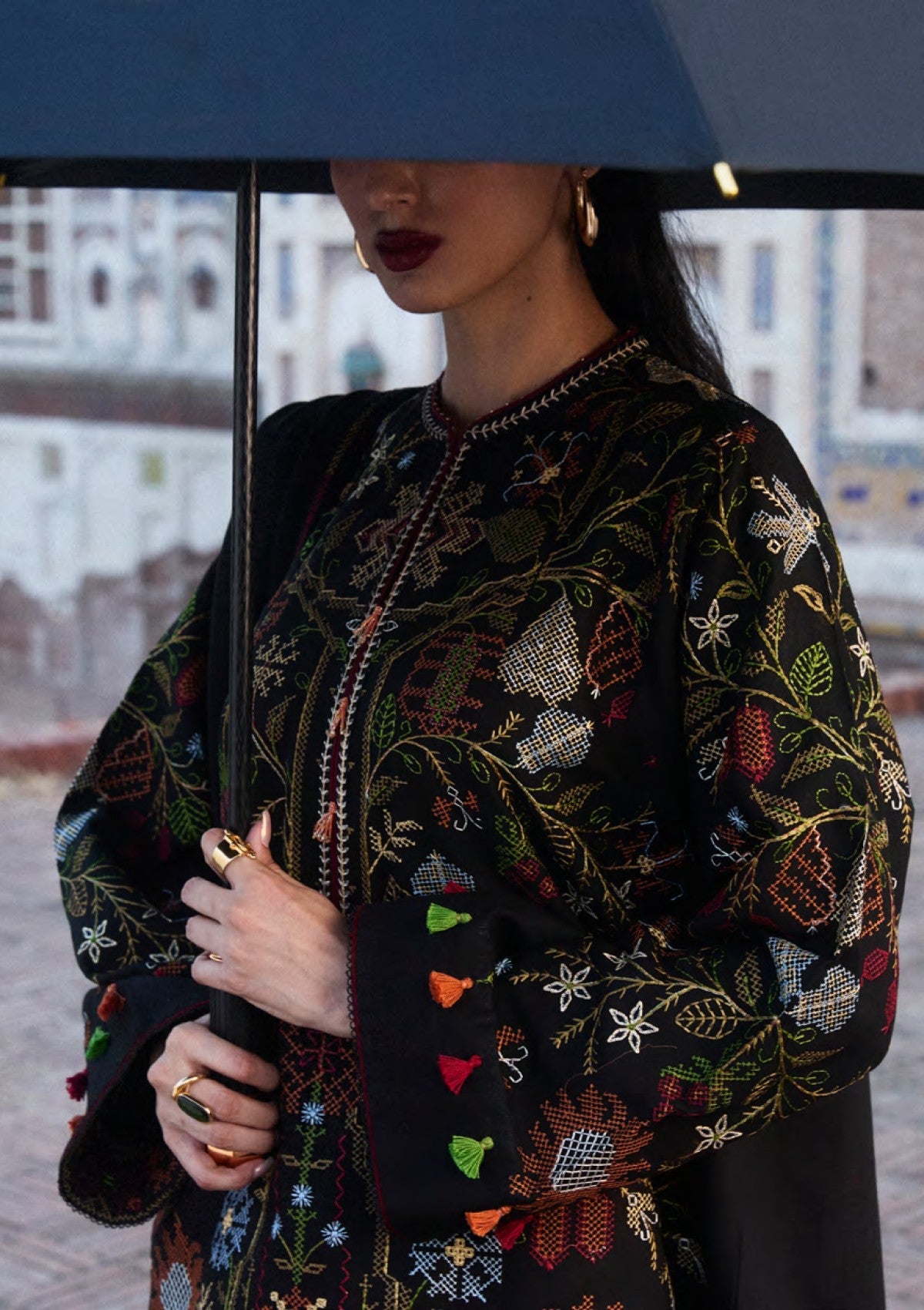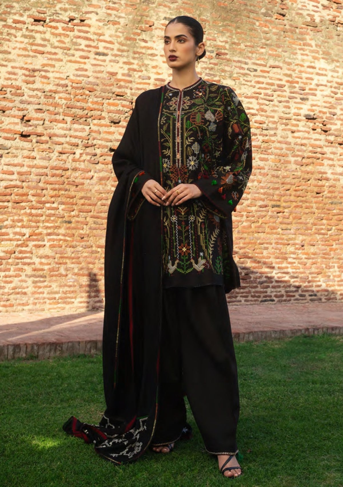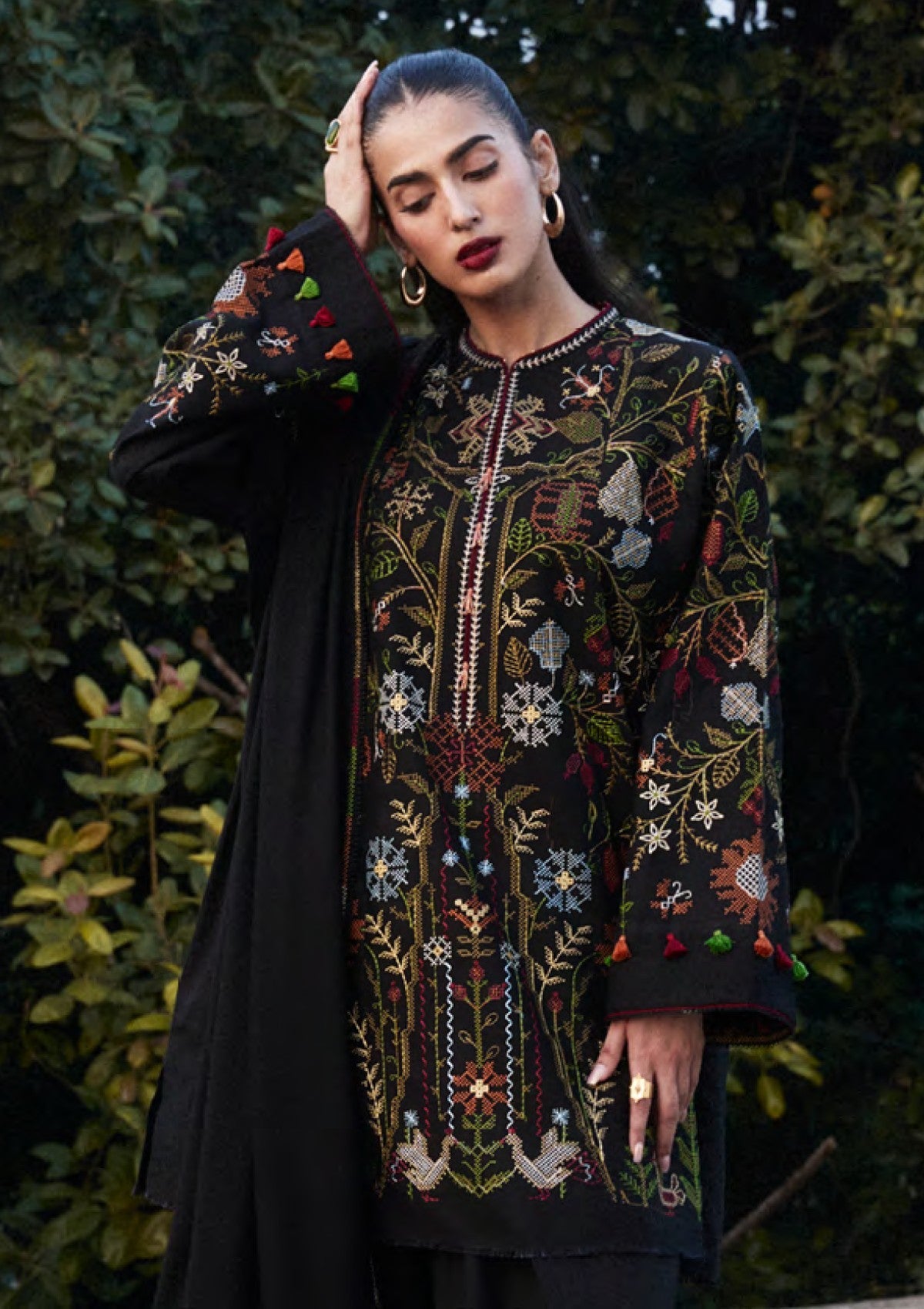 LALEH evokes a feeling of warmth. Embroidered on a black khaddar canvas, this ensemble reveals intricate cross-stitch embroidery on the shirt and a black wool shawl embroidered on all sides to wrap yourself up this winter season.