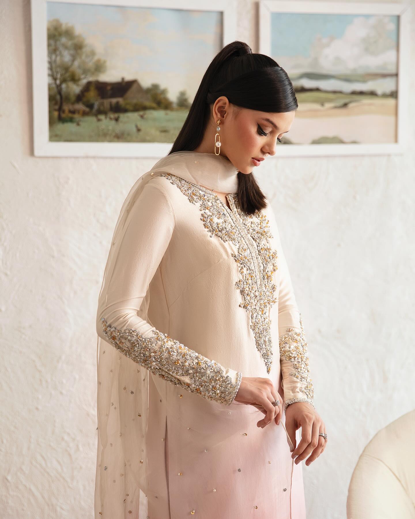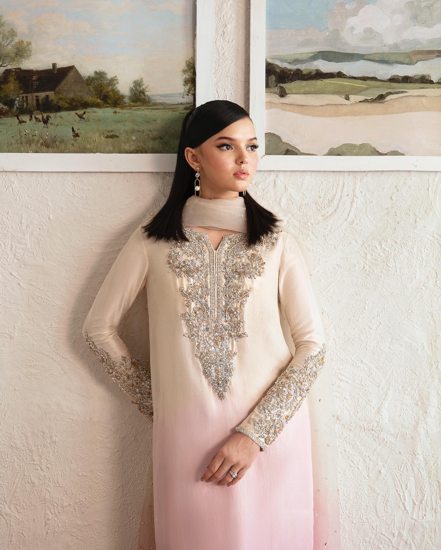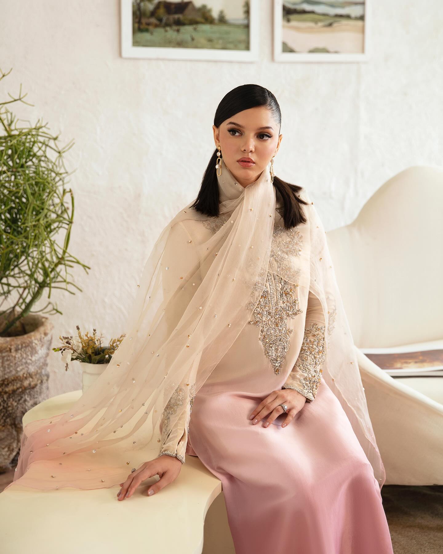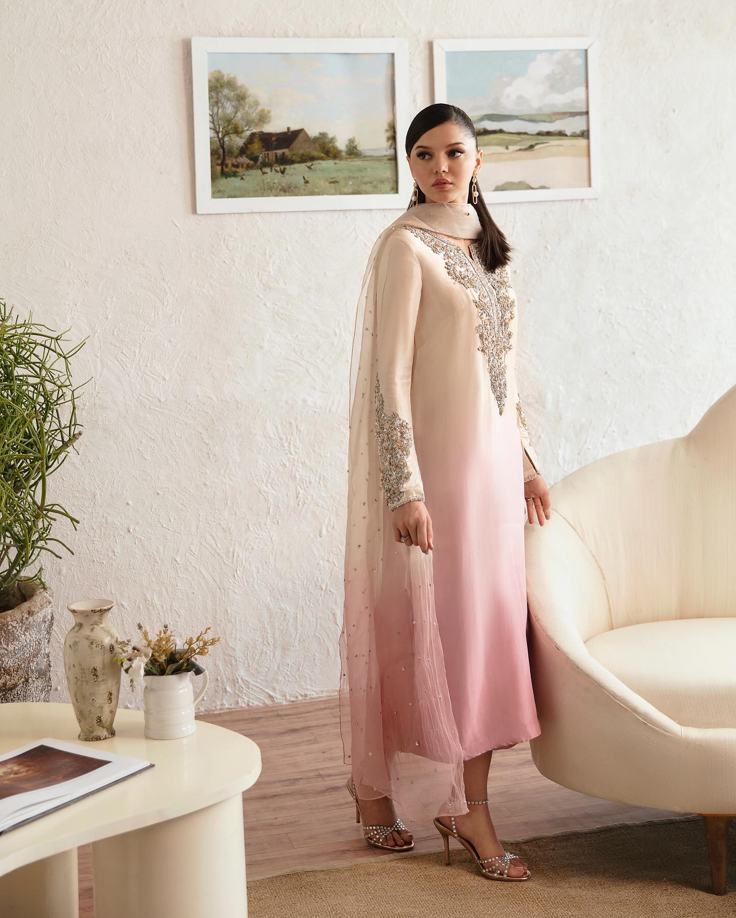 Step into the ethereal realm of “Maura,” where opulence meets elegance in an enchanting harmony of radiant ombre pink hues. Adorned with intricate hand embellishments and flowing culottes, this ensemble invites you to embrace a narrative of unparalleled sophistication and timeless allure.