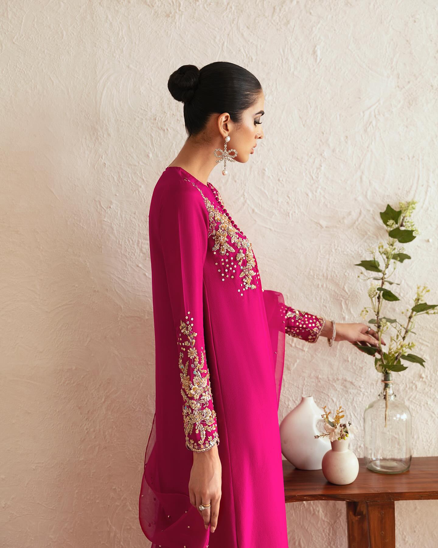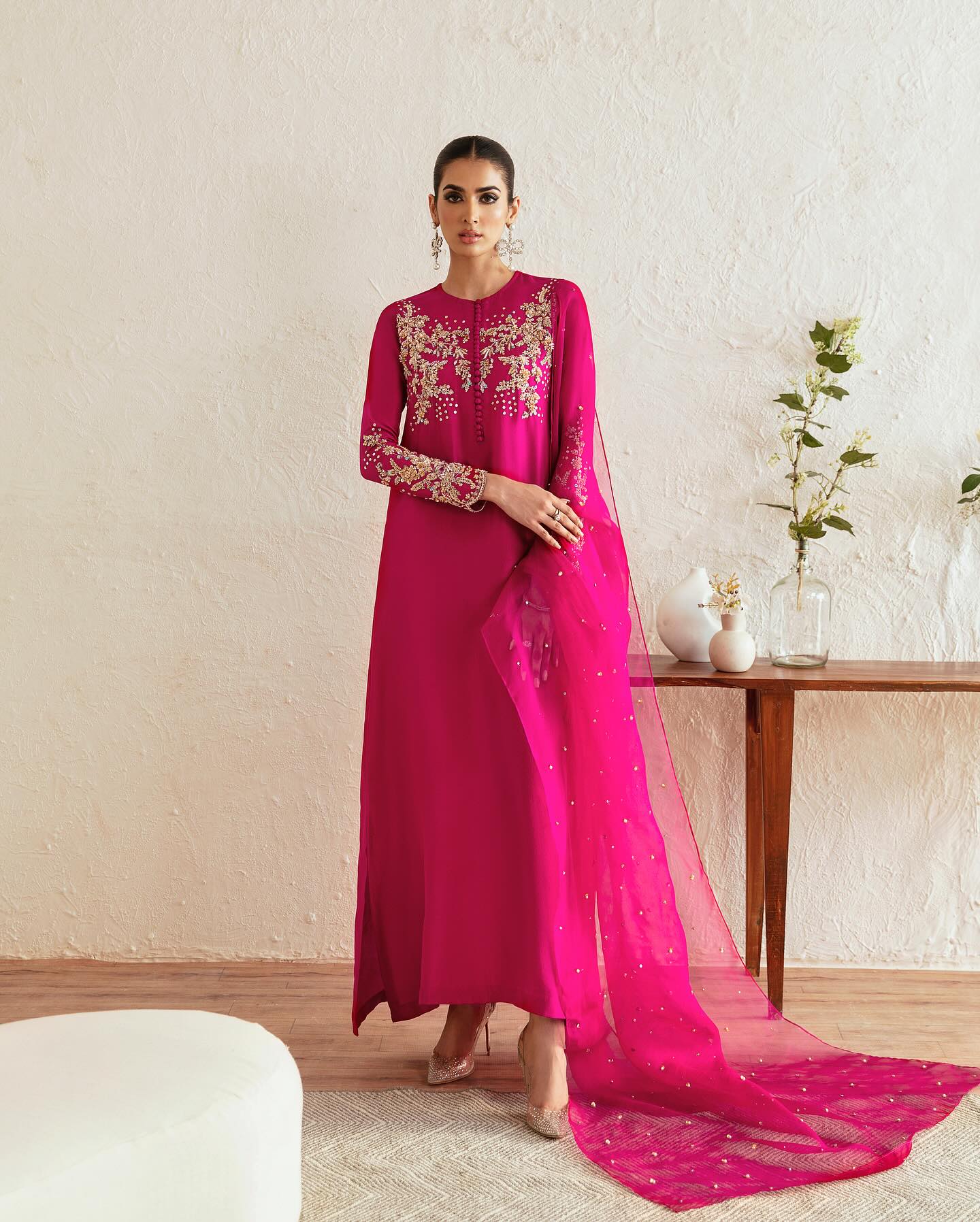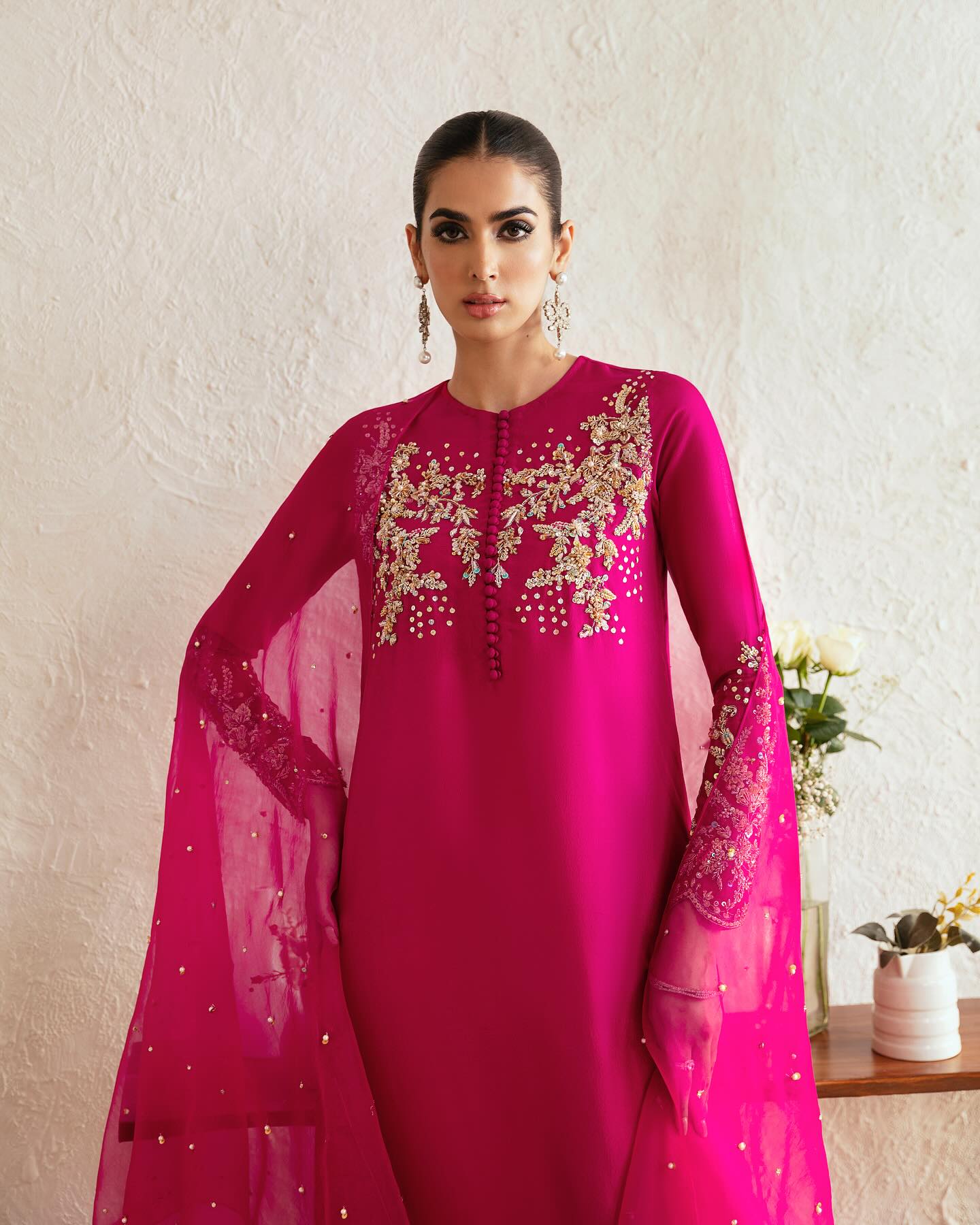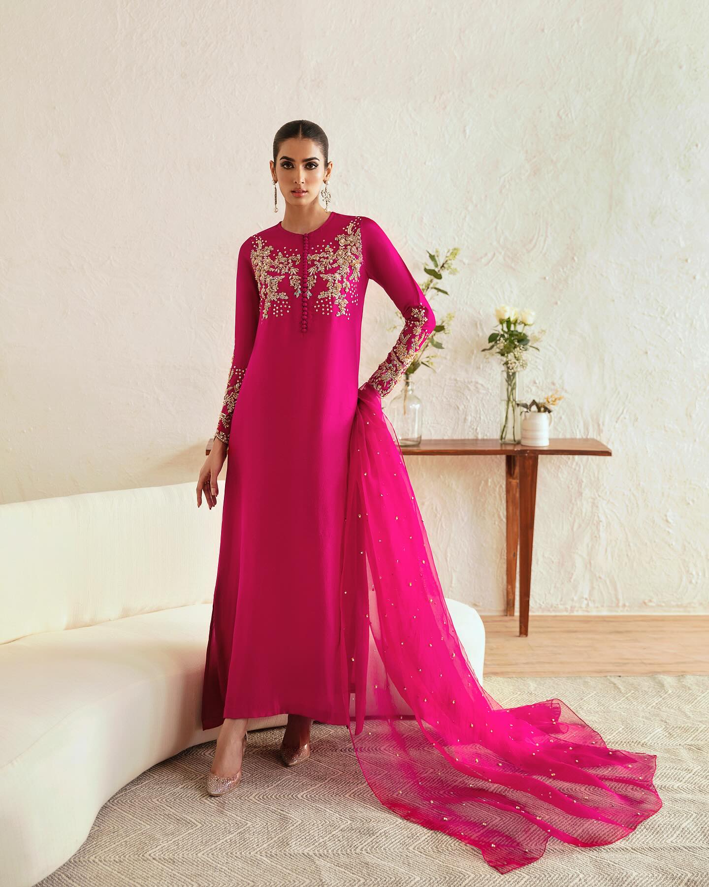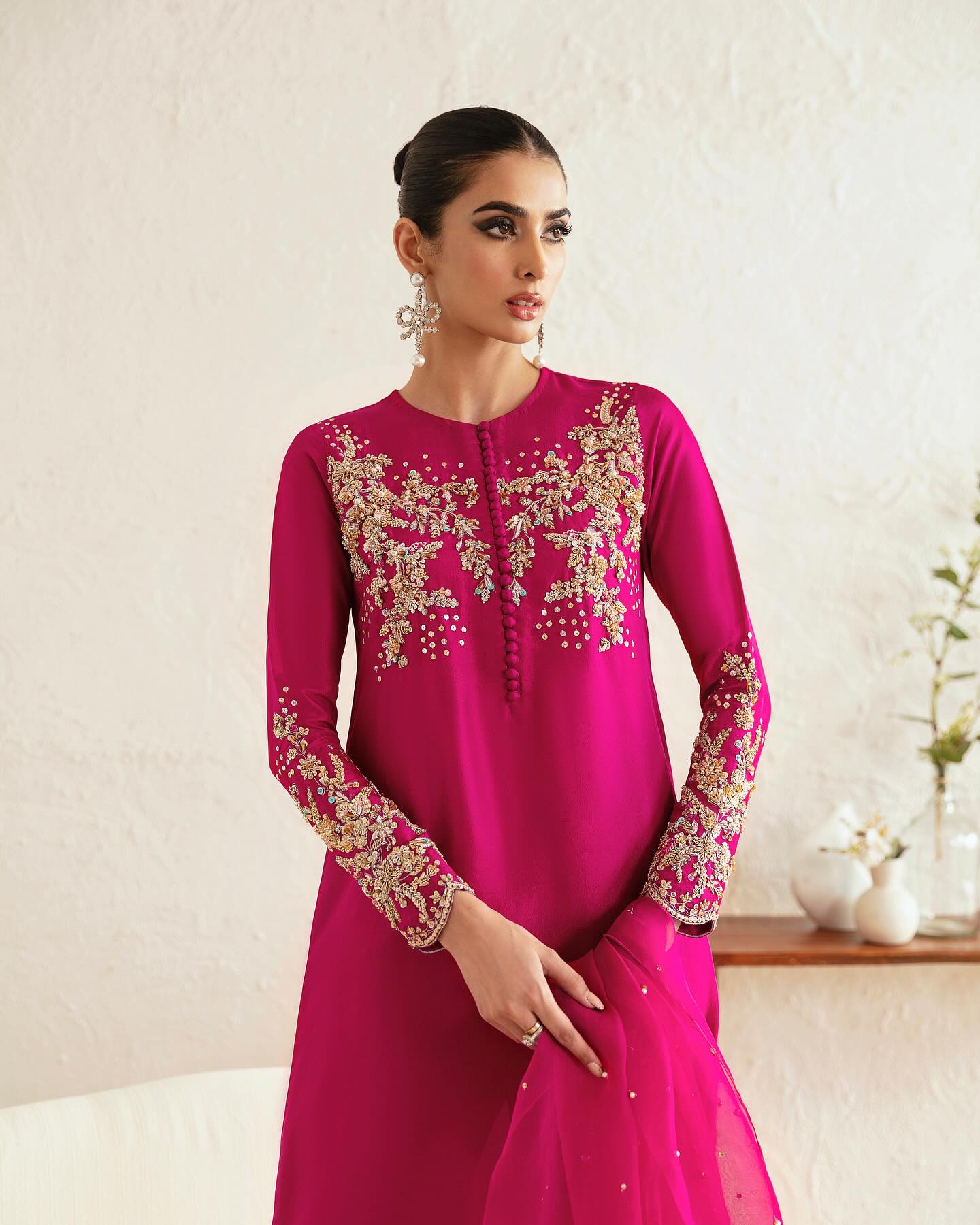 Step into the spotlight with “Myra”, where shocking pink meets timeless elegance. Crafted from luxurious raw silk and adorned with intricate hand embellishments, this ensemble promises to elevate your style with every shimmering detail, ensuring you dazzle effortlessly wherever you go.