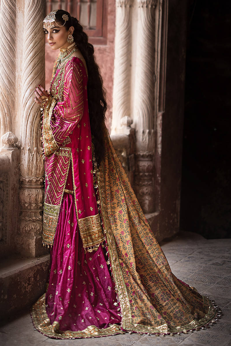 Embroidered organza shirt with 2 different satin silk border (parrot green, mustard) hand embellished pearls sequin mirror work, allover sequin work on sleeves with embroider satin silk border, embroidered gharara with embroidered satin silk border, printed dupatta on cotton slub sequin and embroidered four side satin silk border.