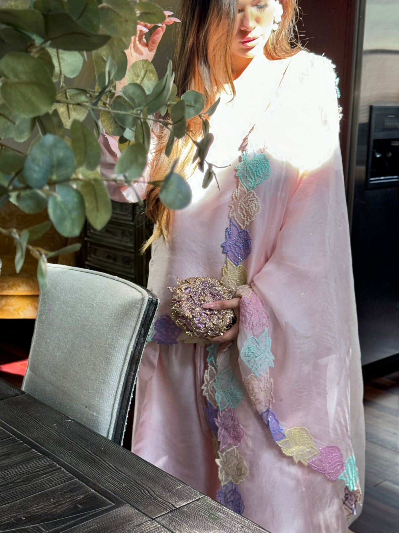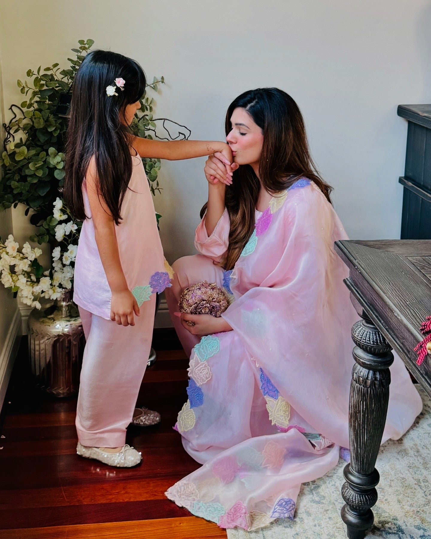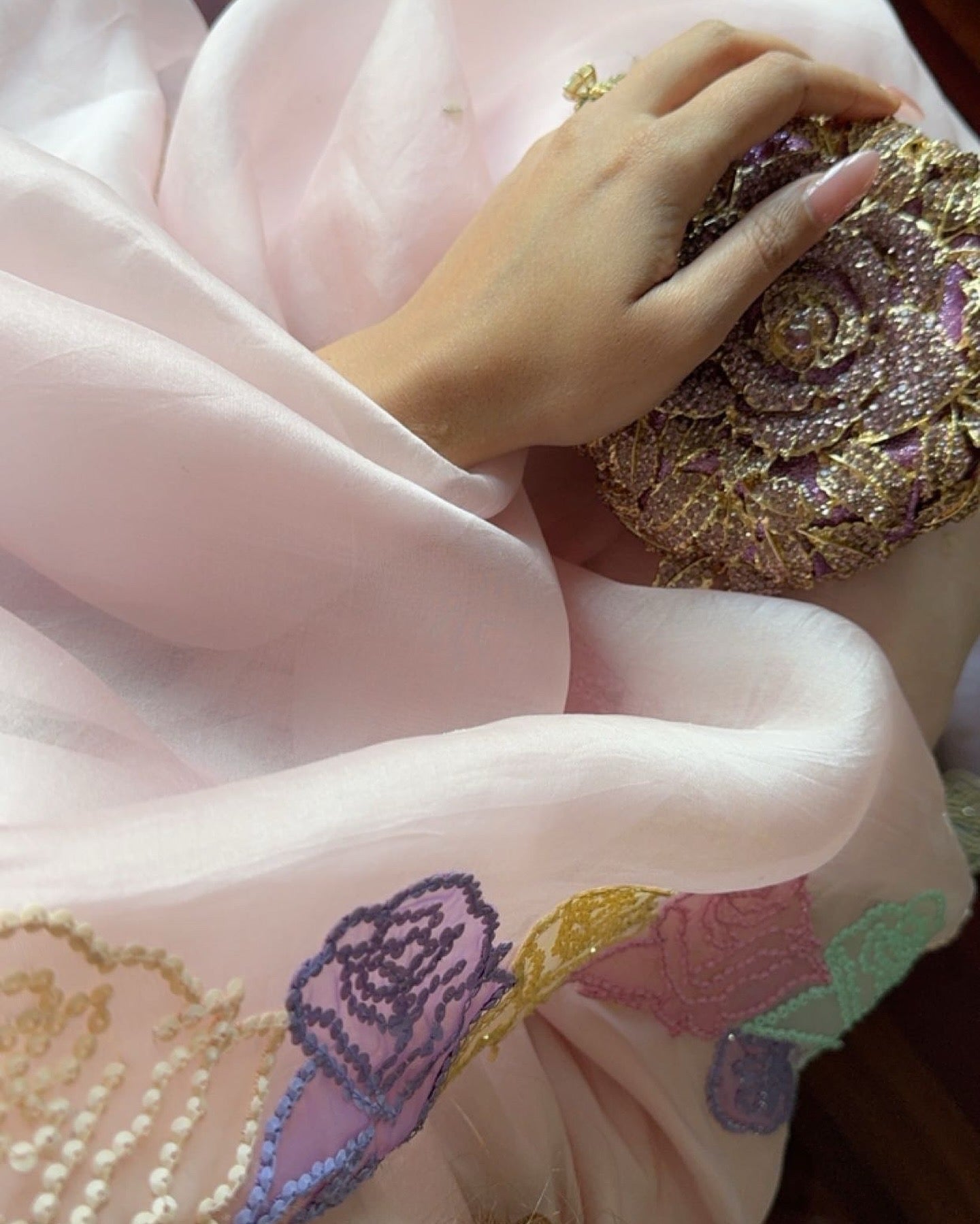 Hand embellished pure organza dupatta with tissue silk hand embellished short shirt and shalwar.