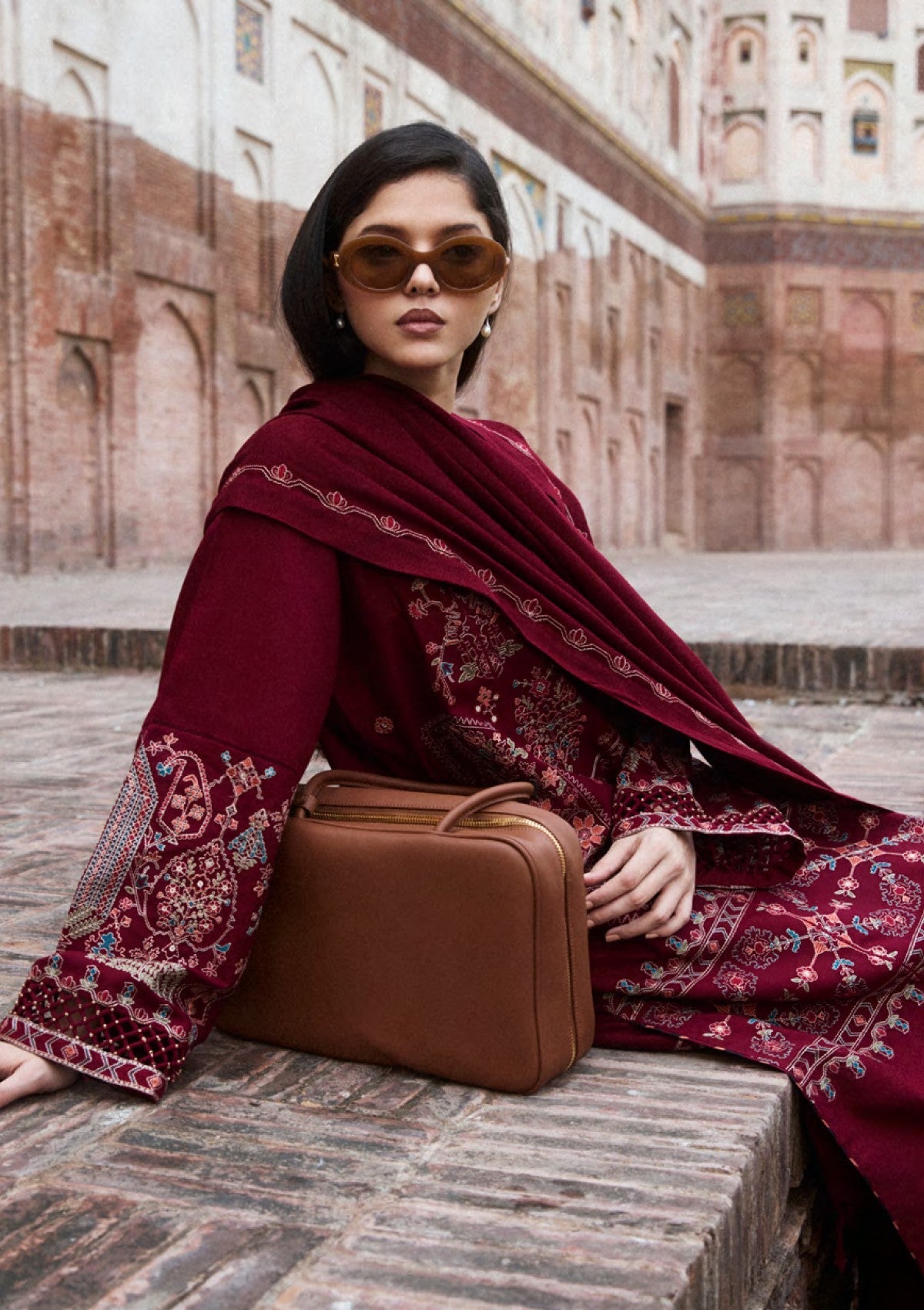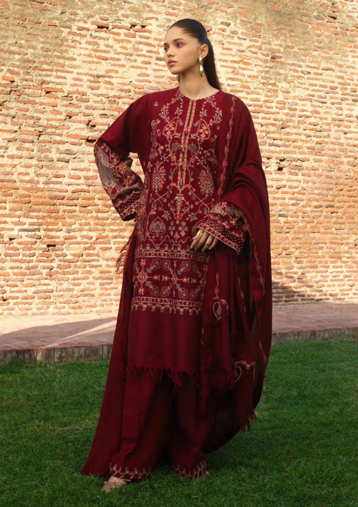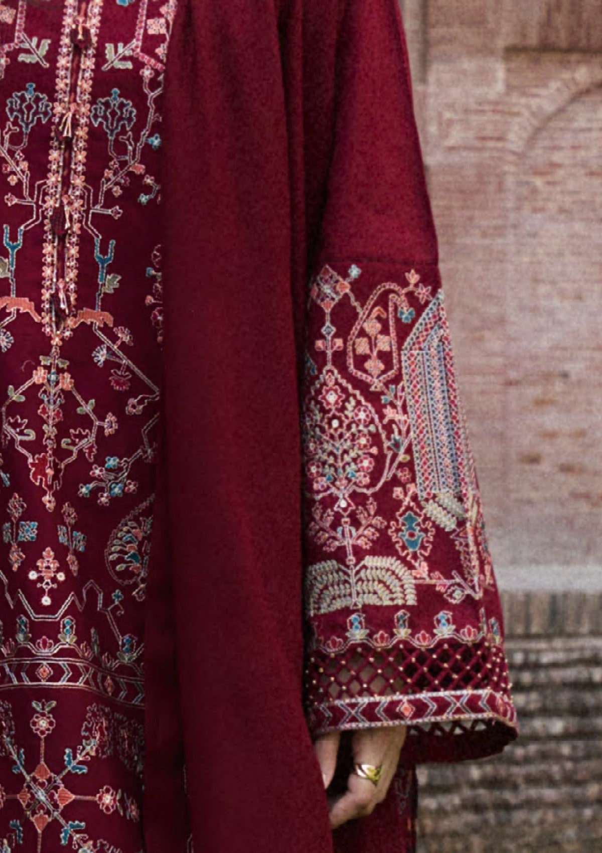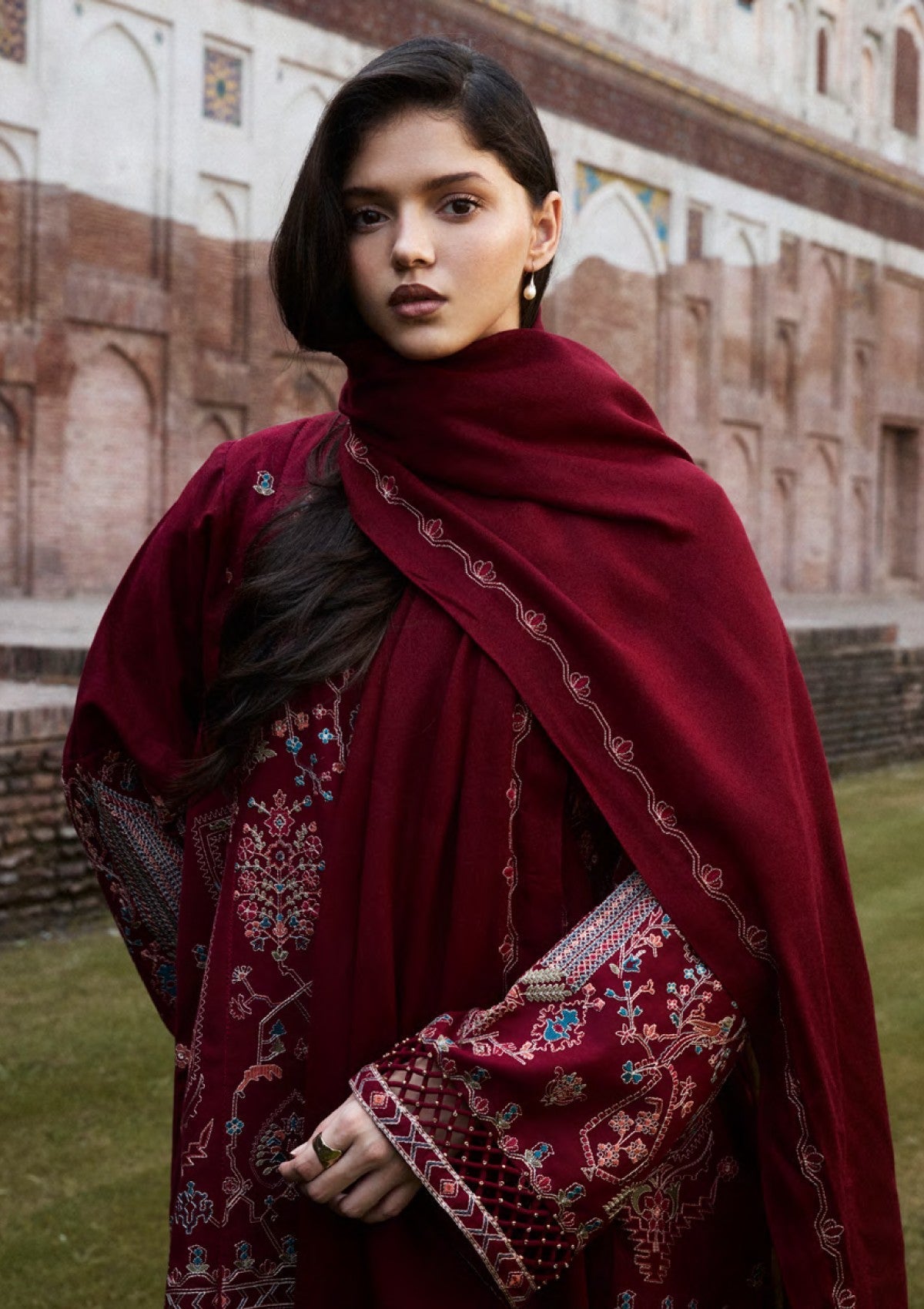 RAHA, in red, is an expression of love. It shows layers of refined embroidery on a khaddar surface with heavily embroidered sleeves and shalwar with an embroidered hem. It is paired with a wool shawl in the same hue, embroidered on all sides to create harmony.