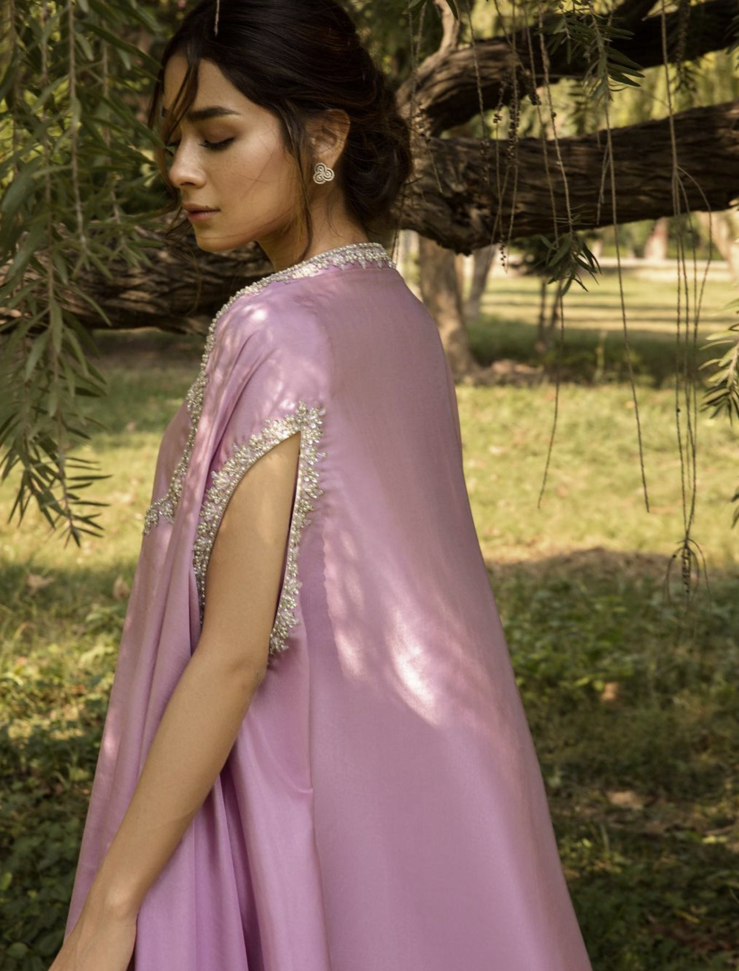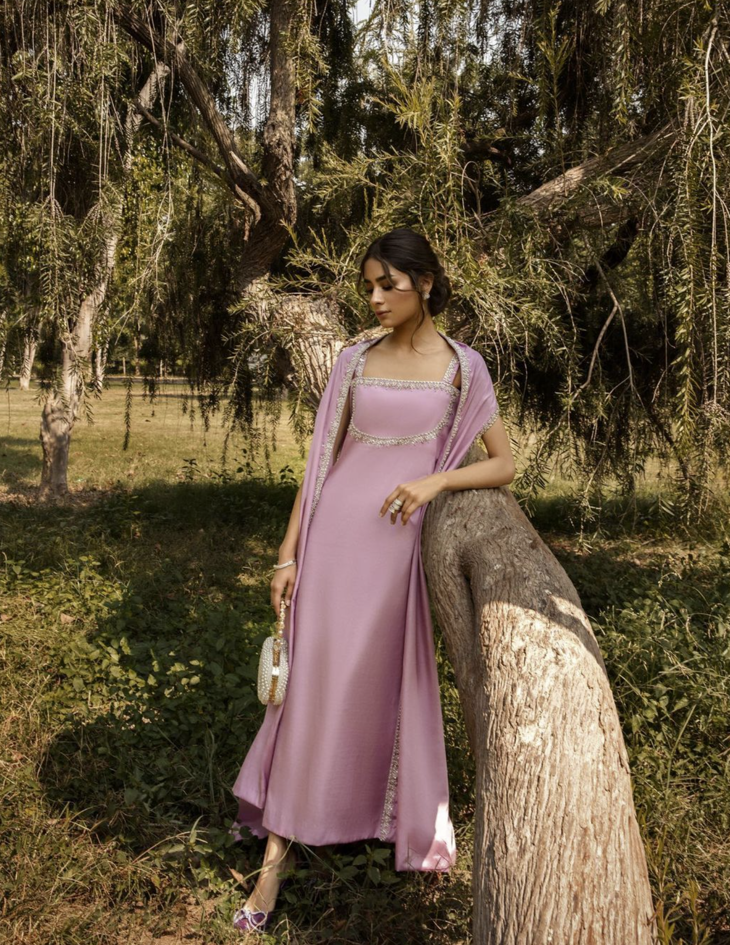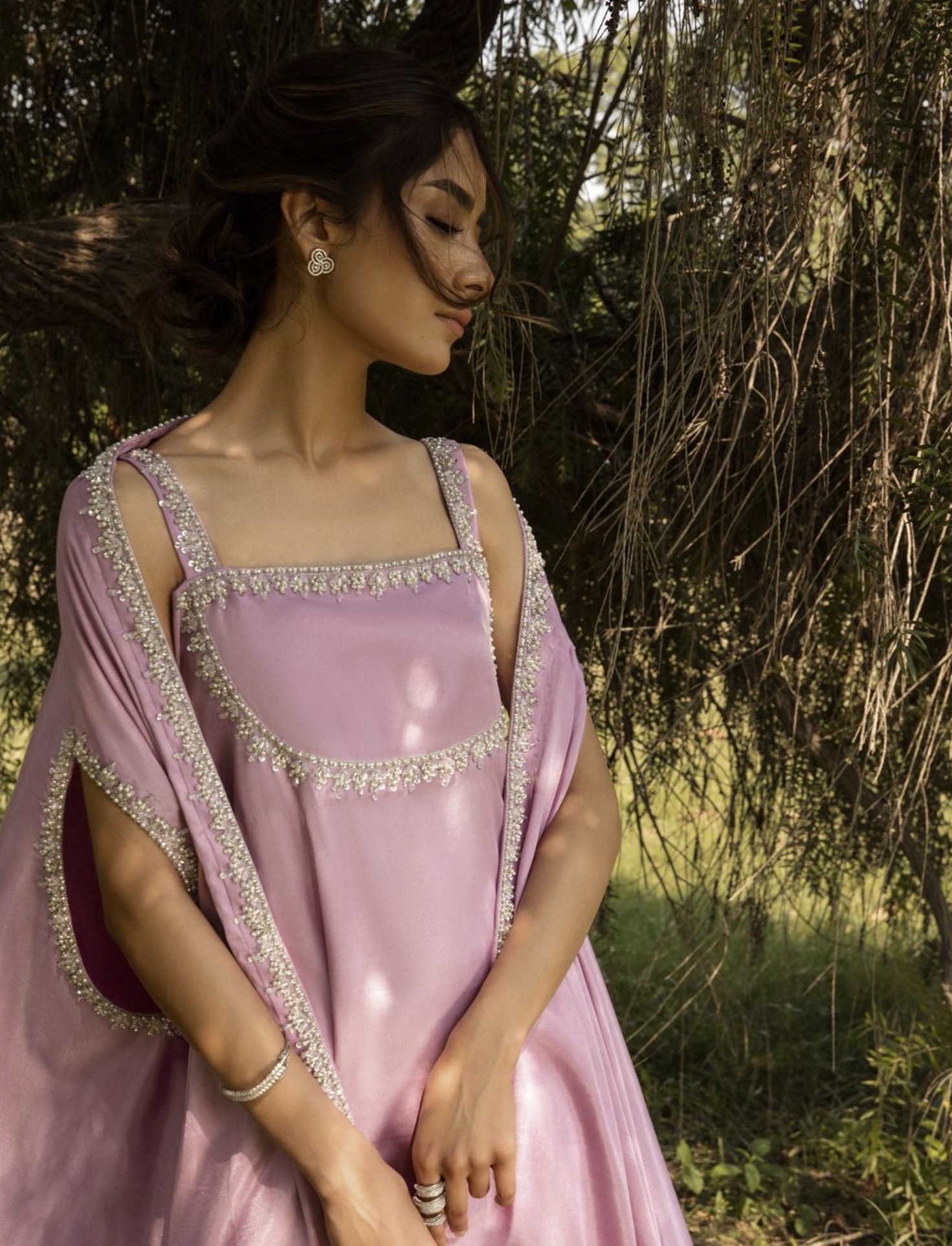 A delightful sheesha silk lilac pink dress intricately handworked on the neckline paired with a floor length cape edged with embellishments for the wearer that values a youthful minimal aesthetic.