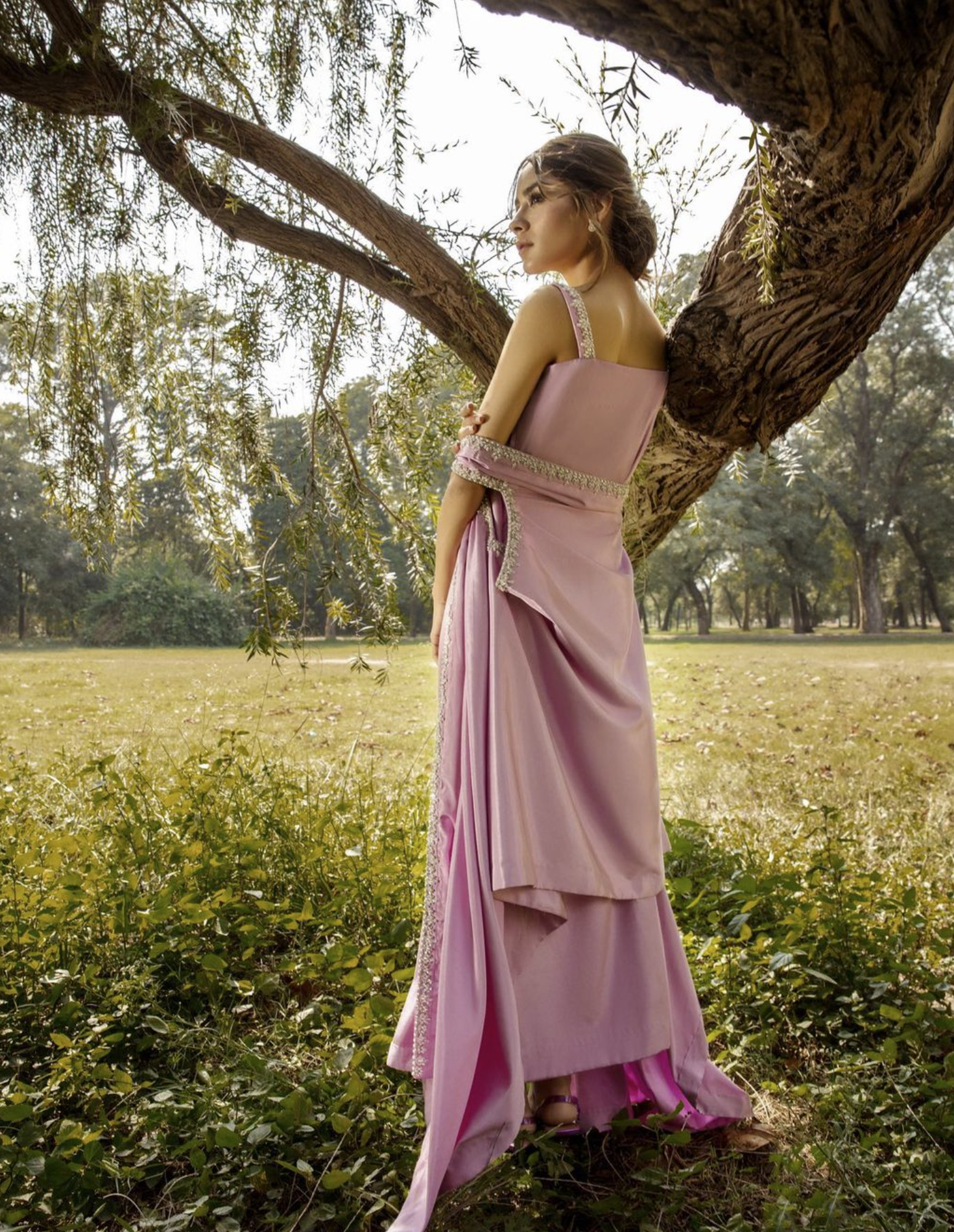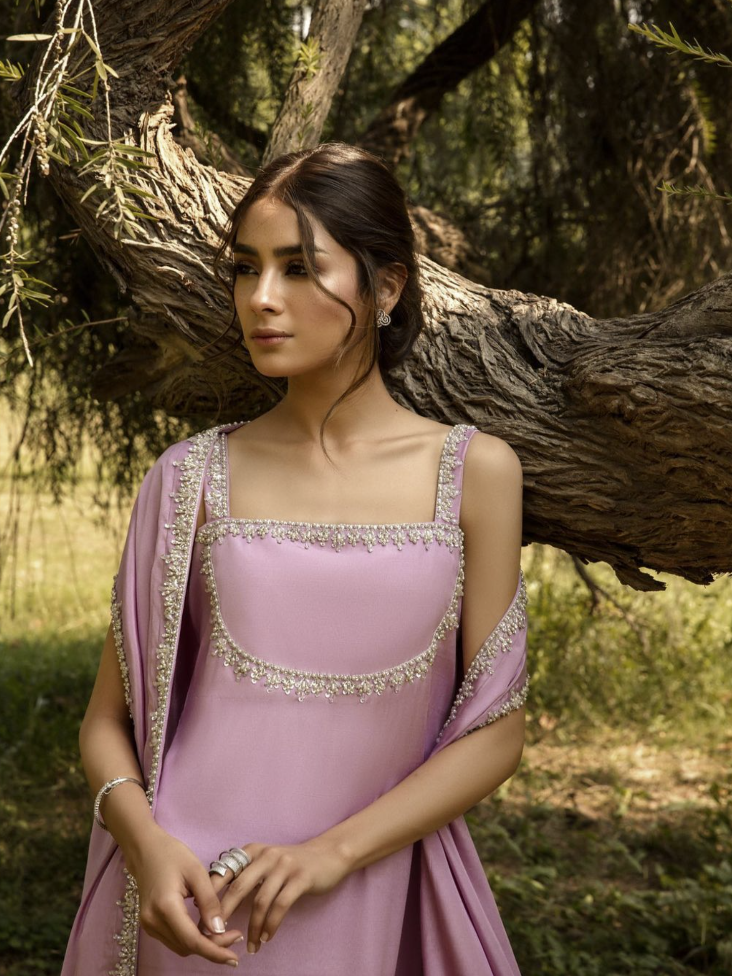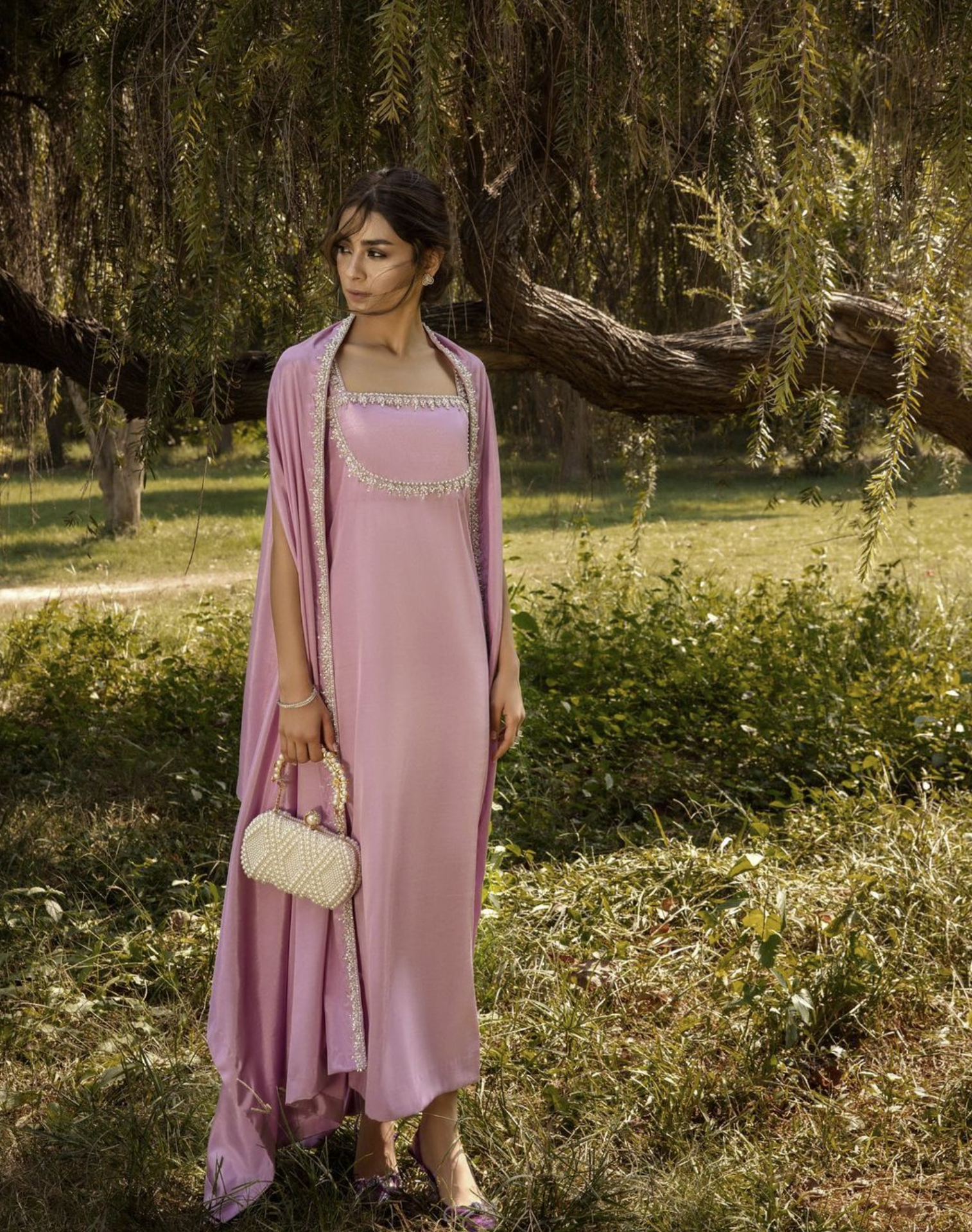 A delightful sheesha silk lilac pink dress intricately handworked on the neckline paired with a floor length cape edged with embellishments for the wearer that values a youthful minimal aesthetic.