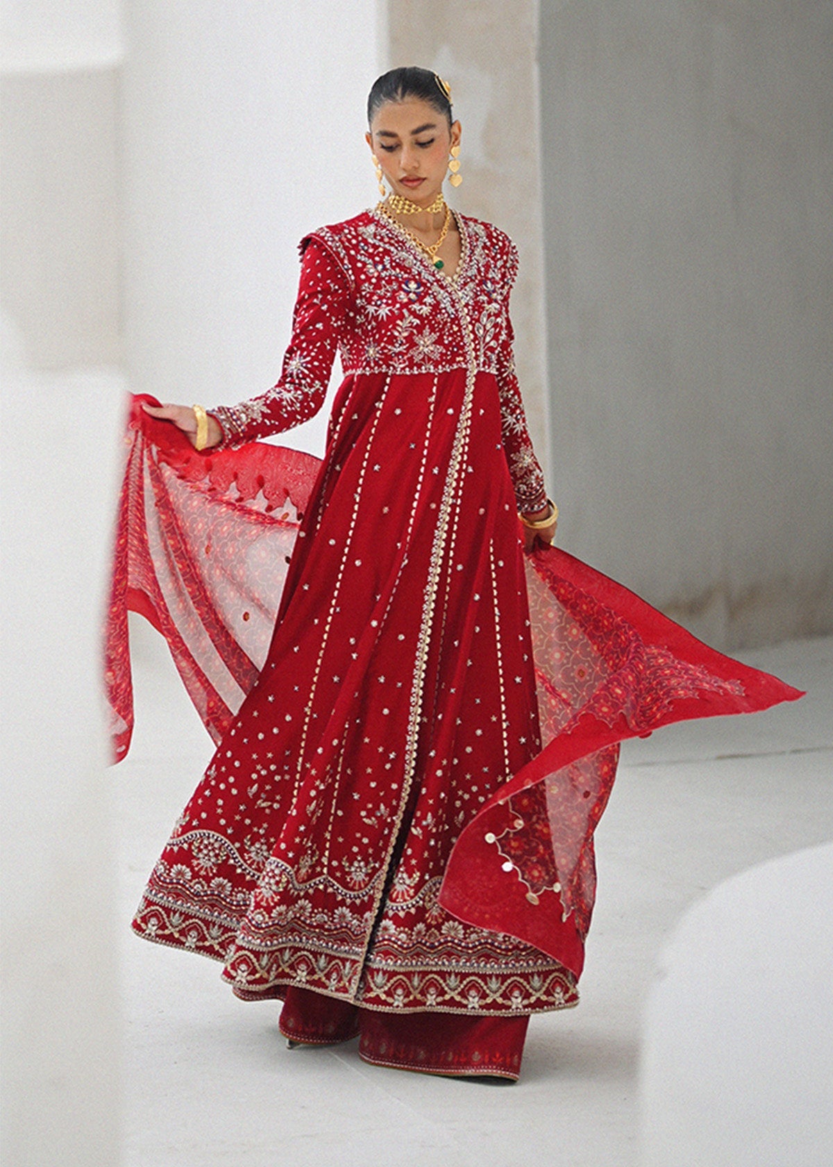 - Ruby red raw silk Front open pishwas with a V neckline and heavy embroidery all over and on border and handwork of pearls and precious stones comes with Fitted sleeves.