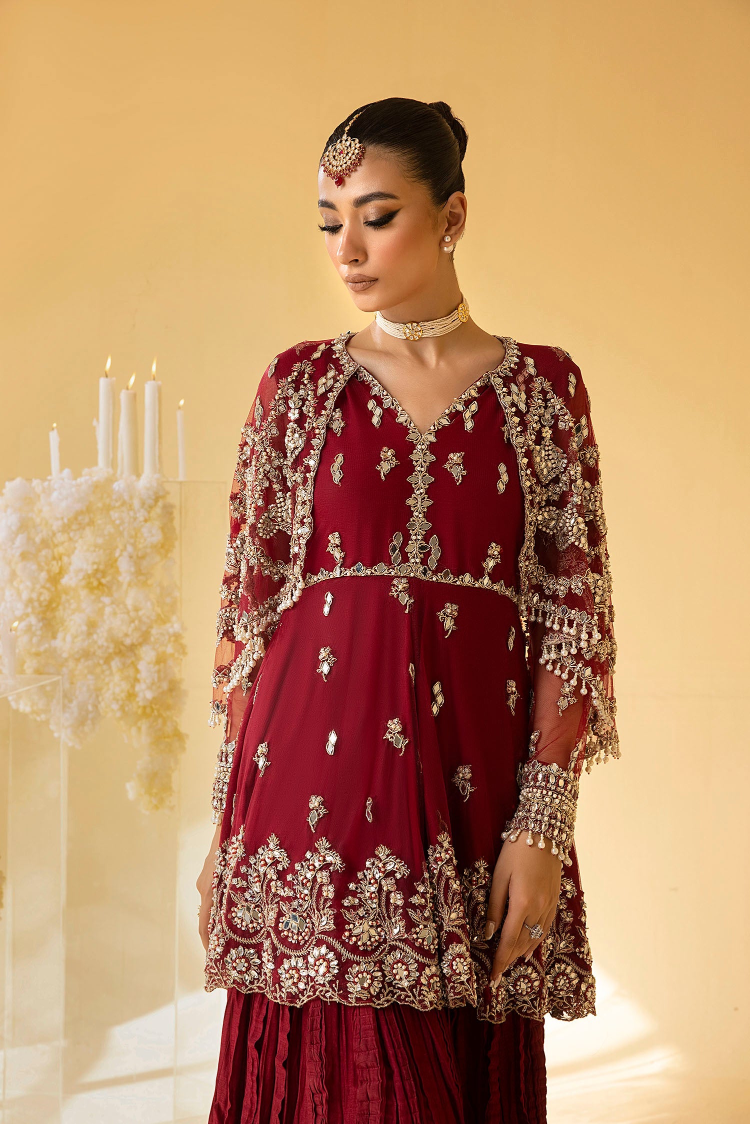 'Scarlet', behold the craftsmanship of this exquisite ensemble - a stunning barn red flared net and cotton silk peplum shirt adorned with intricate floral motifs and a scalloped edgy border, embellished with mirror work, naqshi, dabka, pearls and crystals for a truly enchanting flow. Diligently hand crafted with meticulous care and adorned with intricate detailing, the modern look is complimened with a beautiful cape that is a masterpiece of unparalleled beauty. Further enhanced with a crushed sharara and a classy net dupatta featuring floral embroidered borders, this gorgeous ensmble weaves a contemporary allure with classic design aesthetics to create a refined and celebratory appearance.