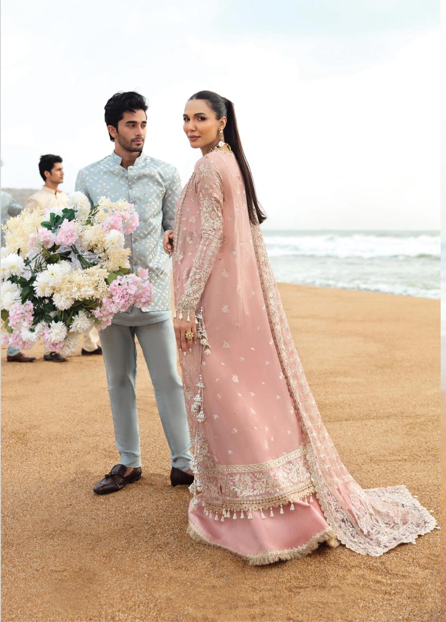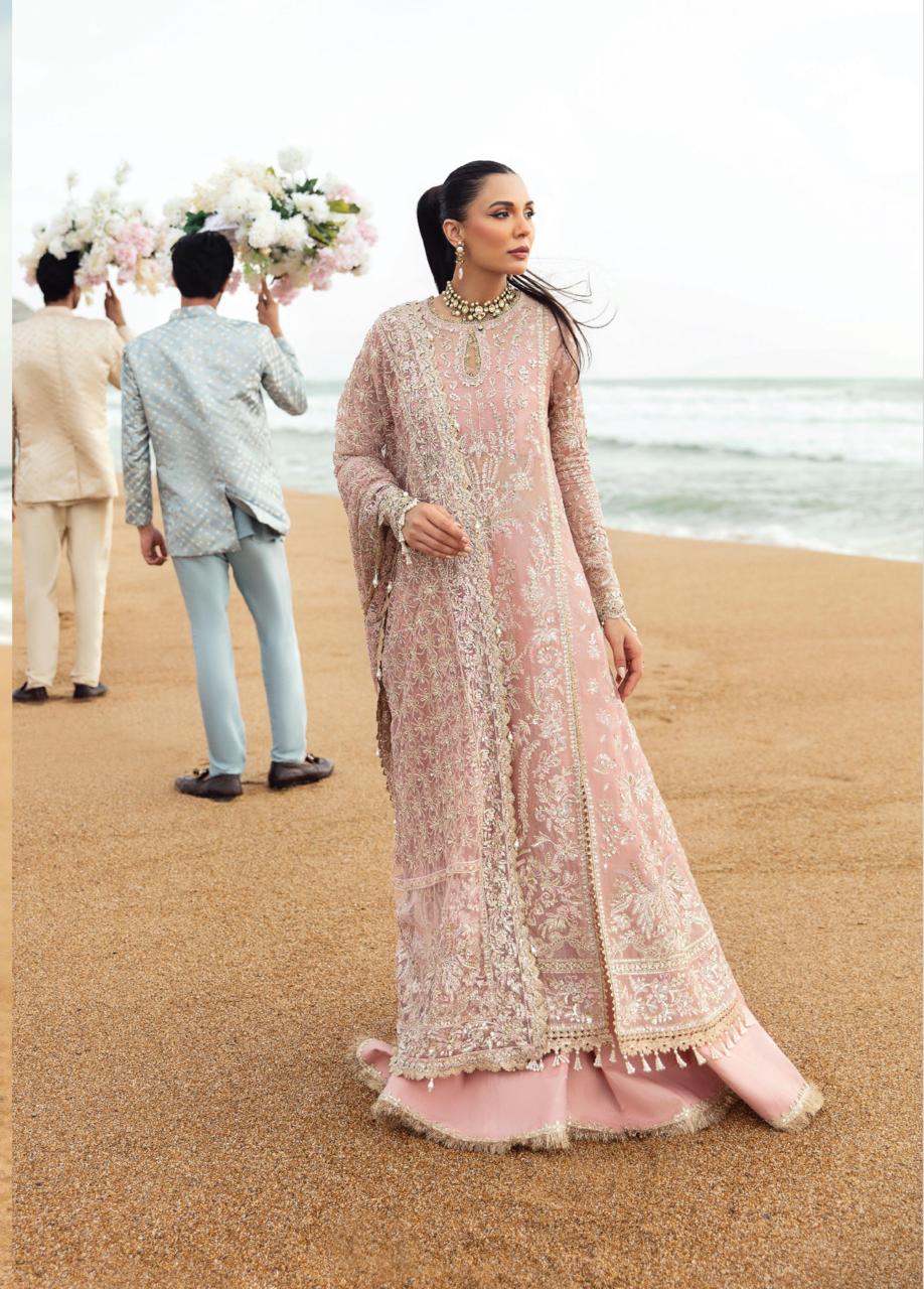 THIS CLASSIC LONG SHIRT IN A DUSTY PINK TISSUE BASE IS METICULOUSLY CRAFTED WITH EXTREMELY INTRICATE EMBELLISHMENTS, FEATURING CONTRASTING ELONGATED THREAD EMBROIDERY, TILLA, AND GOLD SEQUINS. PAIRED WITH RAW SILK PANTS, IT EPITOMIZES ELEGANCE. THE ENSEMBLE IS COMPLETED WITH AN AIRY NET DUPATTA ADORNED WITH AN ALL-OVER JAAL AND HEAVILY EMBELLISHED PALLU, PERFECTING THE LOOK OF GRANDEUR.