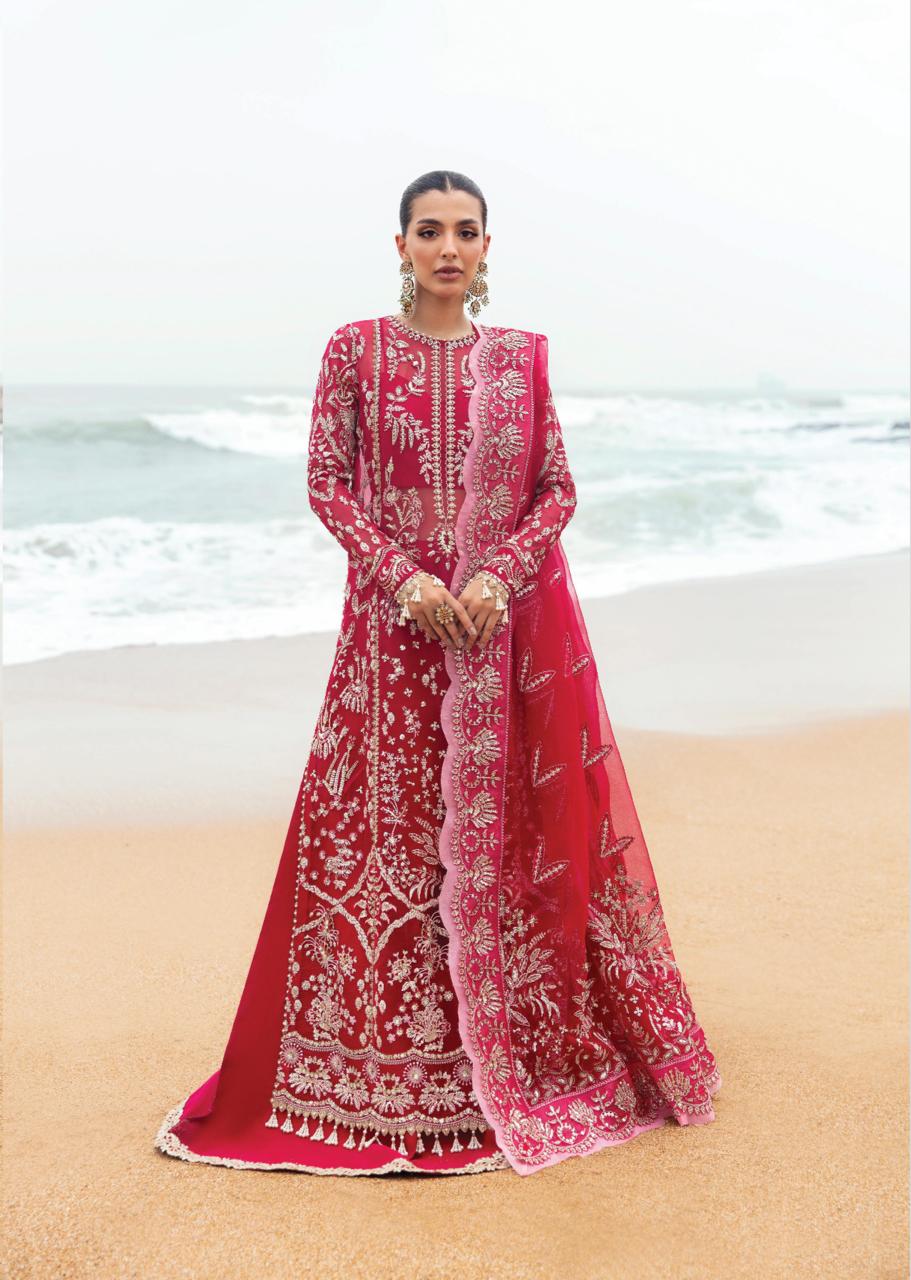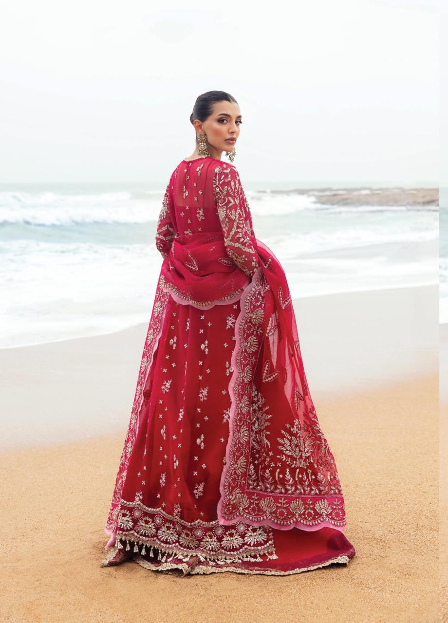 RADIATE WARMTH WITH "NAGEEN" IN A RICH RUBY PINKISH-RED HUE. THIS A-LINE SHIRT, CRAFTED FROM SOFT ORGANZA FABRIC AND ADORNED WITH OPULENT THREAD EMBROIDERY, DULL GOLD TILLA, AND SEQUINS, CELEBRATES LUXURIOUS CRAFTSMANSHIP. PAIRED WITH RAW SILK PANTS AND AN ORGANZA DUPATTA FEATURING MODERN FLORAL TWO-TONE SCALLOPED BORDERS, IT EXUDES AN AIRY ELEGANCE, PRESENTING A VISION OF REFINED BEAUTY.