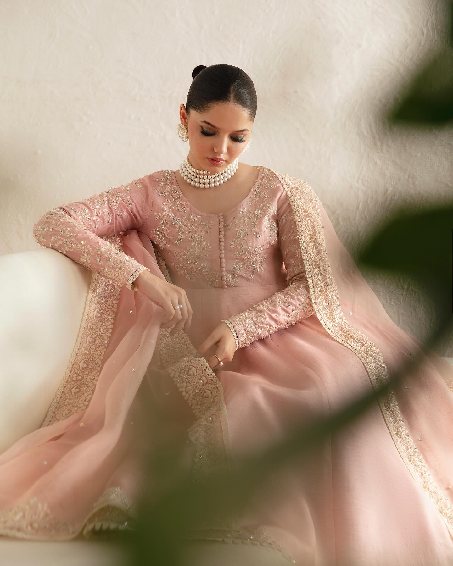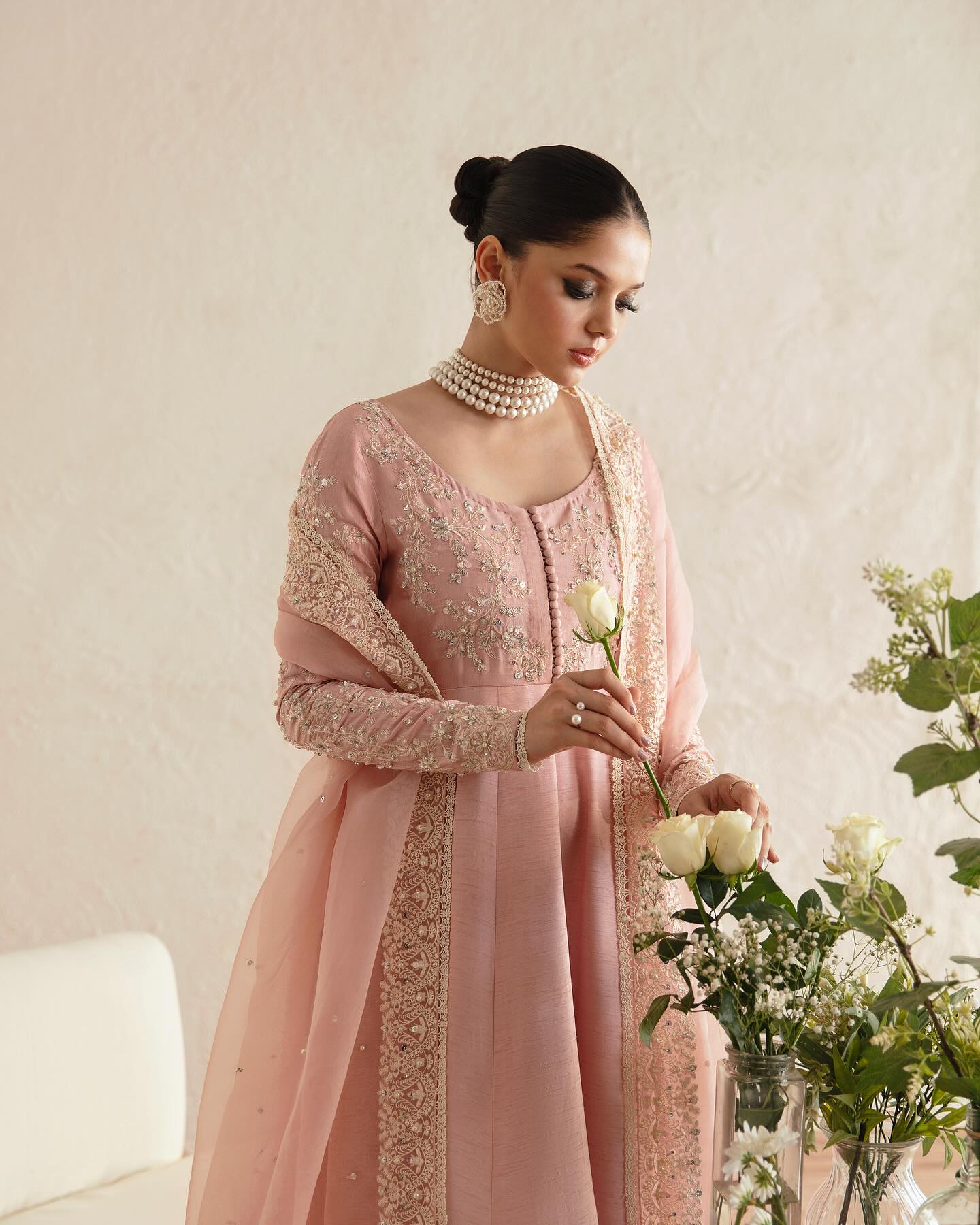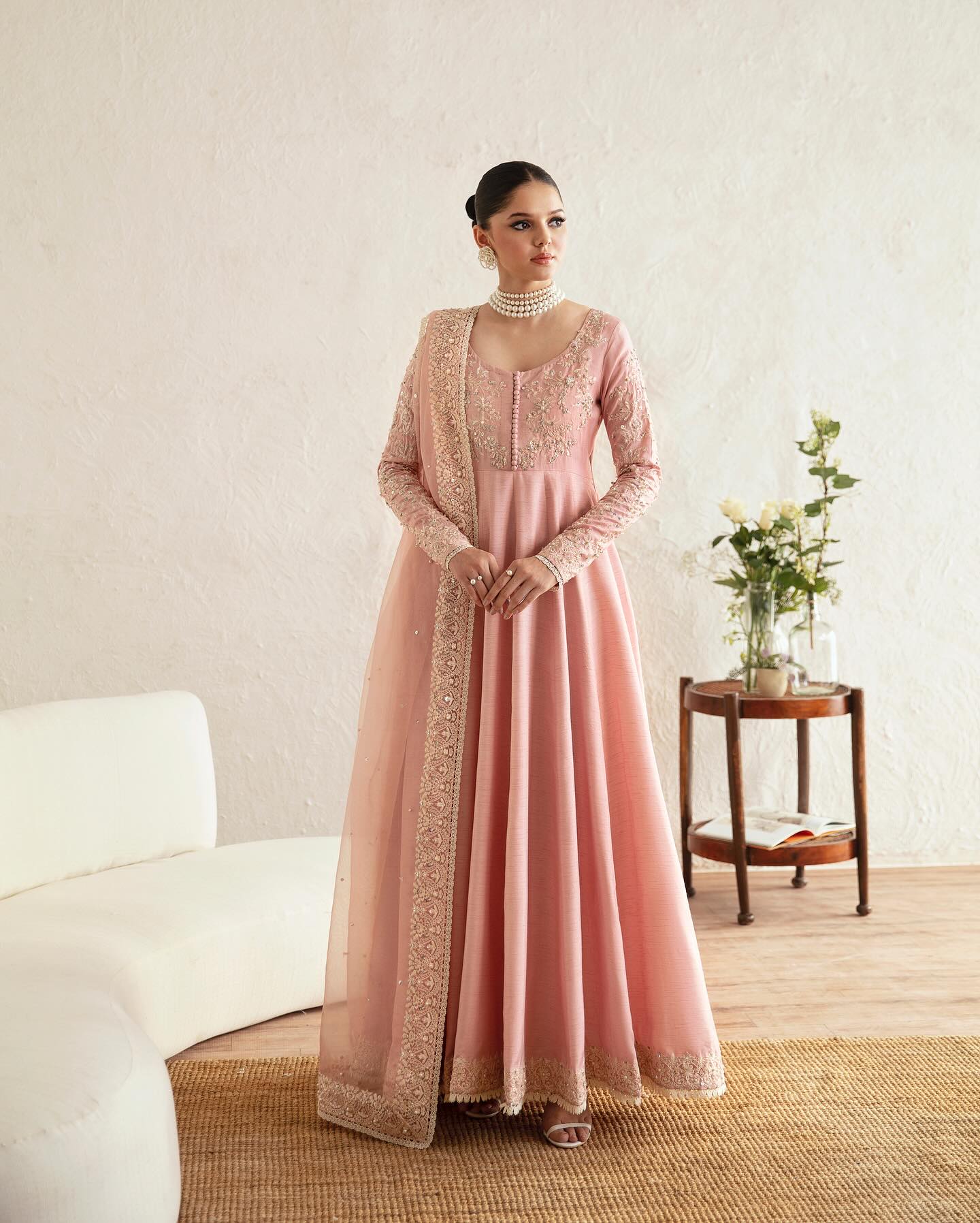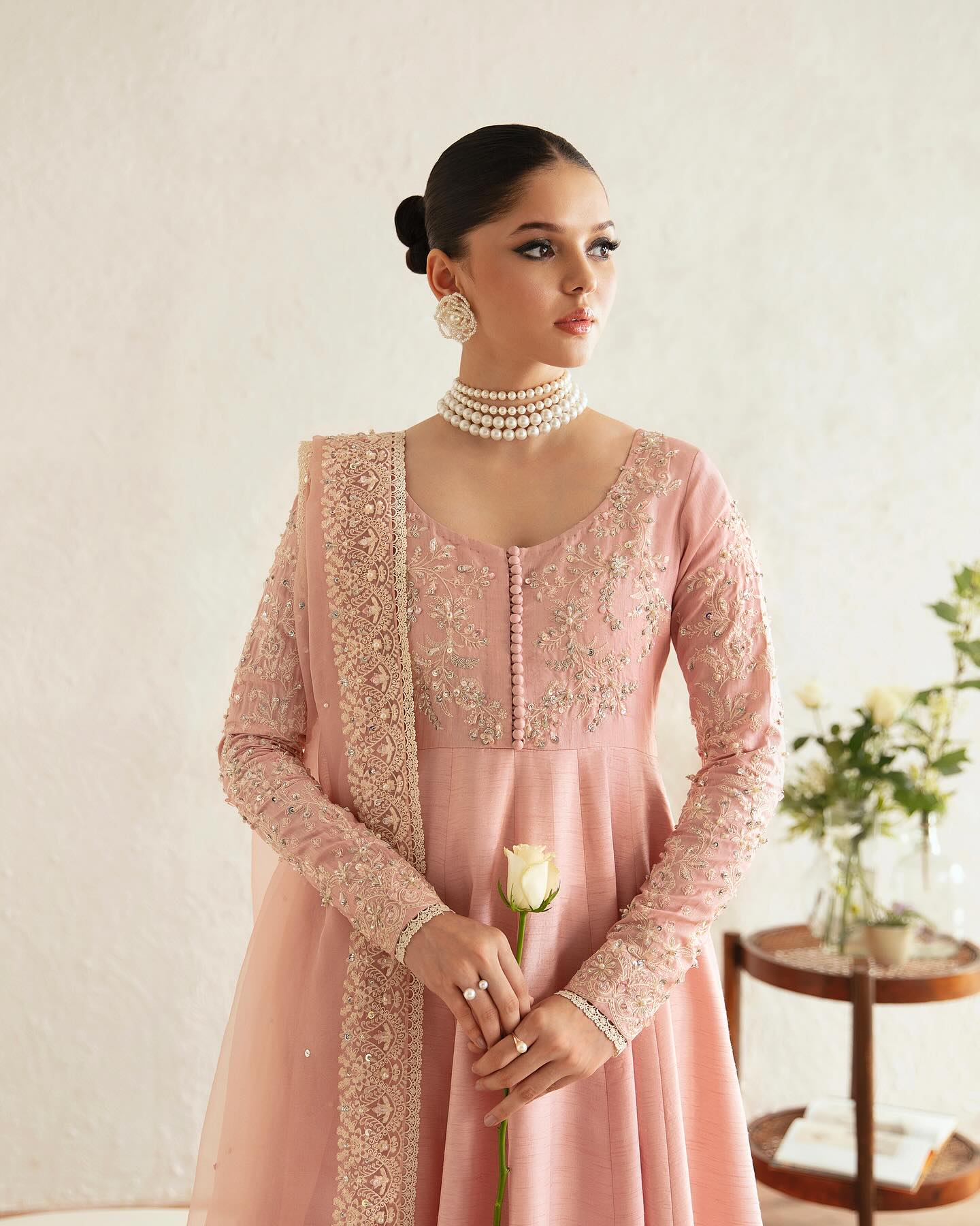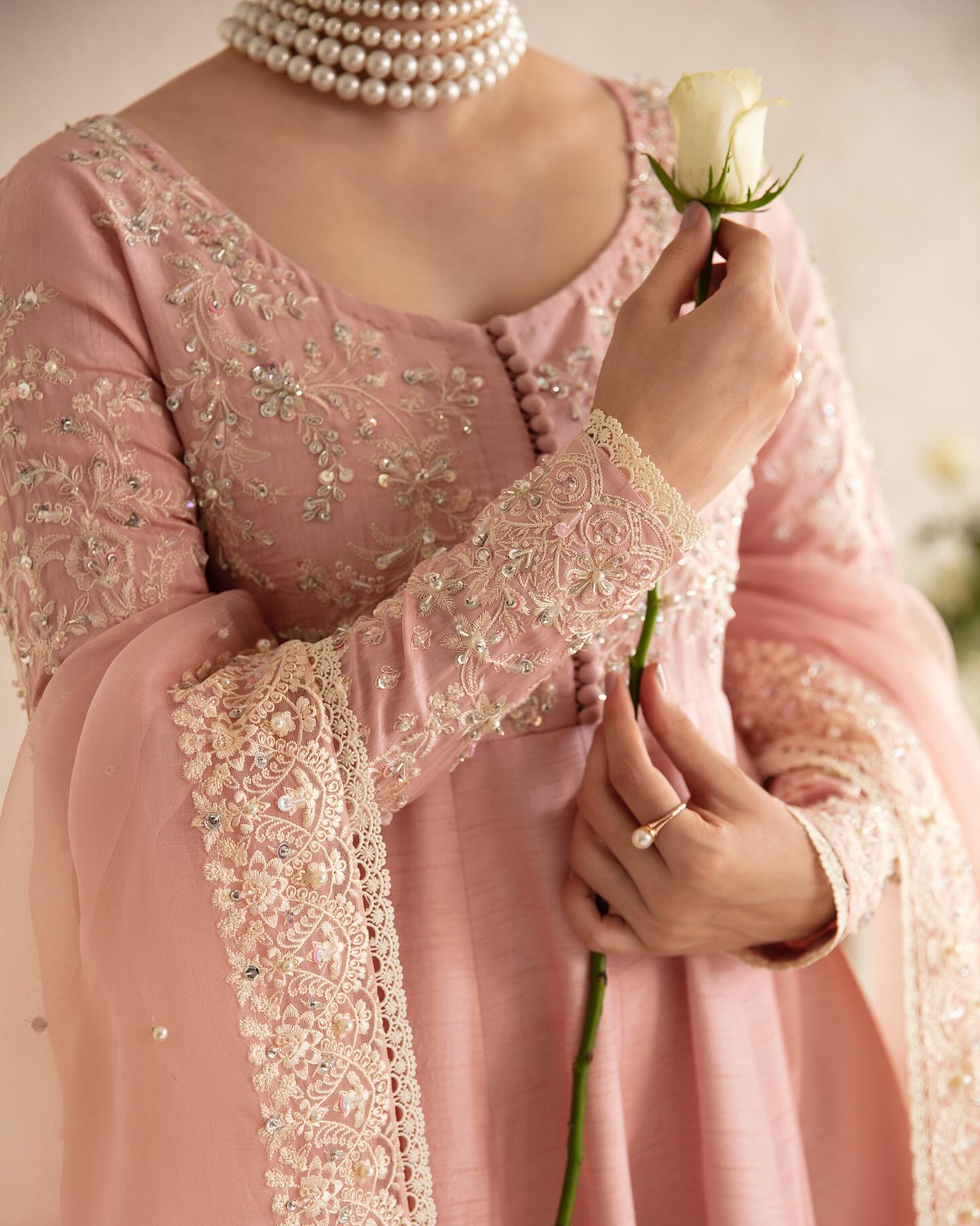 Step into a realm of timeless elegance with “Tierra”, where blush pink meets enchanting craftsmanship. This exquisite pishwas, crafted from Korean raw silk and adorned with delicate embroidery and hand embellishments, promises to imbue every occasion with grace and sophistication, ensuring you radiate regal charm with every step.